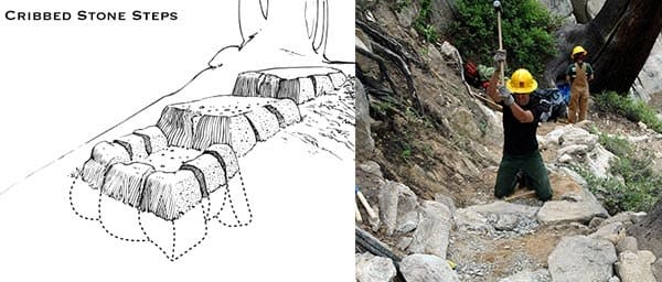 Staircases: Stairs can be ideal solutions for getting hikers up short, steep ascents. With rock bars and coordination, a crew can leverage rocks of several hundred pounds into position and lock them together for durability and use. Cribs of natural or milled timber can be set in a slope and then filled with gravel to form walking surfaces.