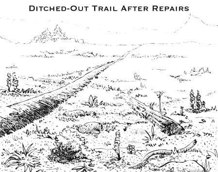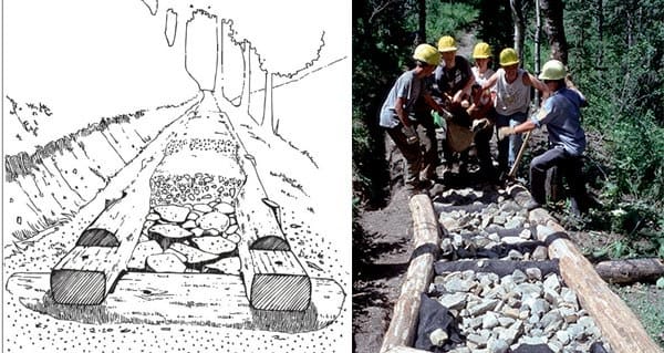 Turnpike: Turnpikes raise the tread to get the walking surface above a boggy area. Logs or rocks installed on either side hold layers of rock and gravel in place.