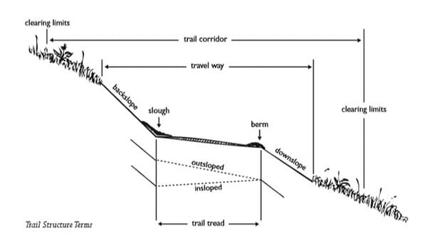 Tread: The walking surface of a trail. Ideally, it is slightly out sloped - tipped so that rainwater and snowmelt drain off quickly rather than flowing down the trail and causing erosion. Tread maintenance often involves removing buildup of soil and forest debris from the outside edge (where it is called berm) and the inside edge (slough). A travel corridor cleared of brush on either side and above the tread provides clearance for travelers.