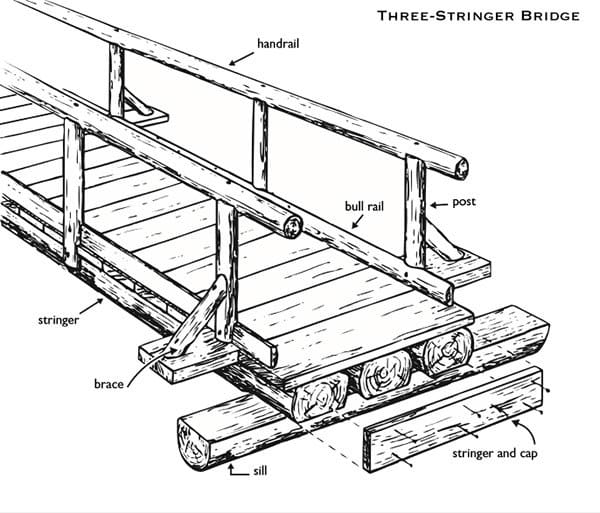 Bridges: Consider where a rustic bridge is placed – usually a narrow point in a stream, ideally with rock outcroppings as immovable foundations. Look underneath and you’ll probably find sill logs parallel to the stream. The stringer logs that cross the water rest on the sills. Bull rails on either side of the decking prevent the feet of hikers and horses from slipping off the edges.