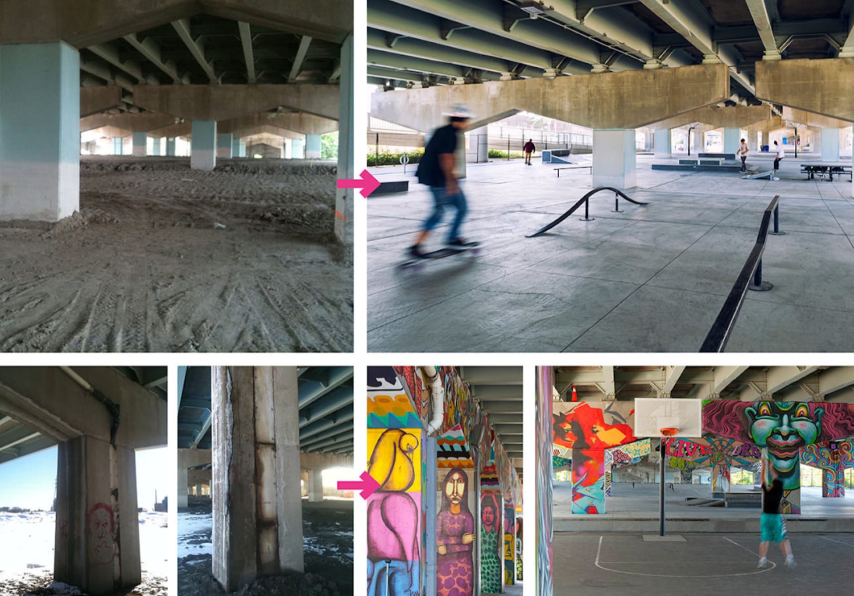 Before the transformation into Underpass Park, the underpass used to be a forgotten and dangerous space where it was prone to illegal activities and parking. By adding a variety of floral, places for recreational activity, colorful wall structures and vibrant lights, the space was turned into the Underpass Park. The transformation not only made it a much safer place, it also brought the community together. People are also encouraged to add their own touch to the park through graffiti.