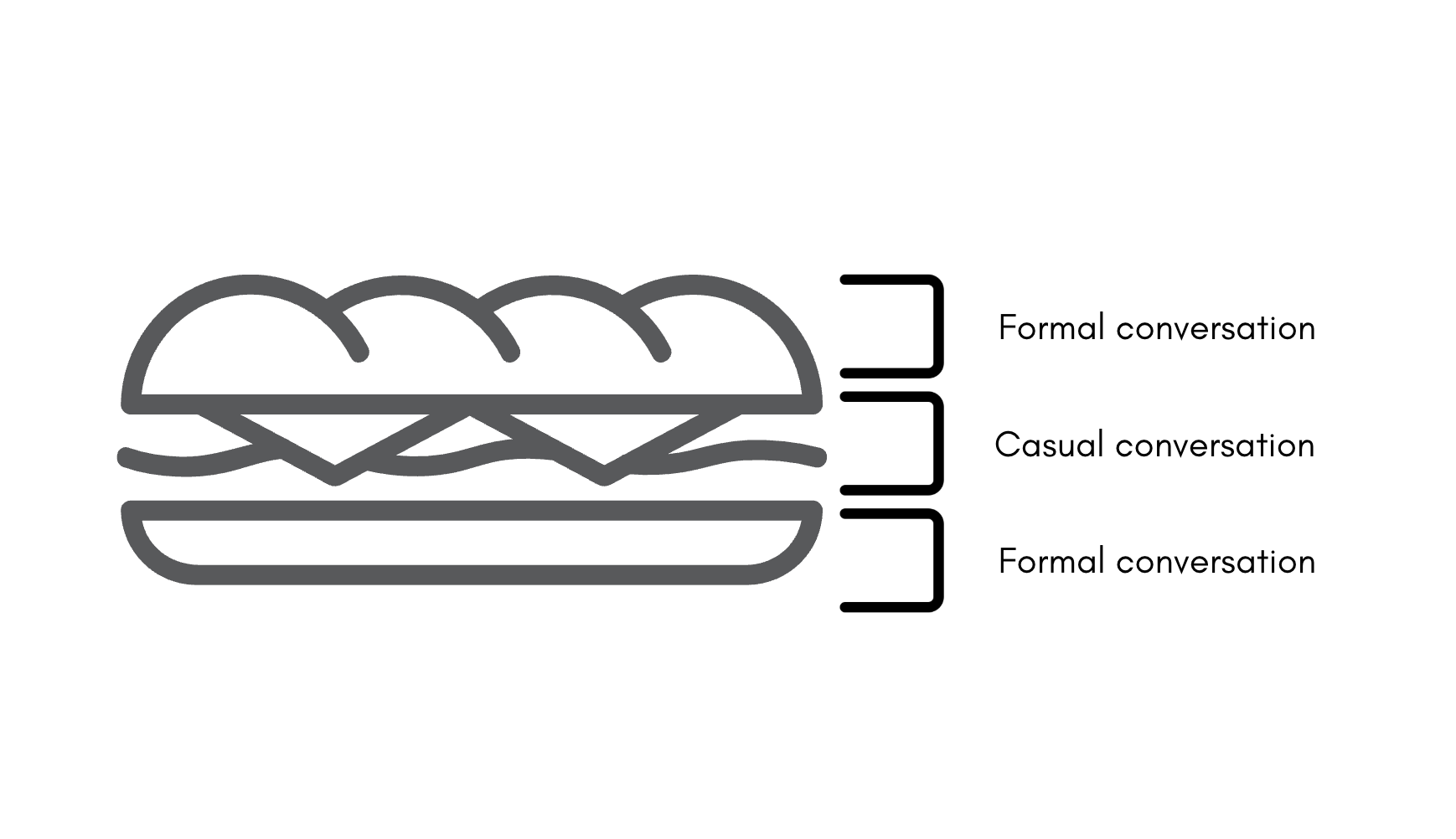 In my observation session at The Marzetti Company, a company based in Westerville, OH, I came across an interesting phenomenon occurring when coworkers talked with one another, I call it a "conversation sandwich" (Figure 3). It's where casual talk was inserted between formal/work related talk. I noticed that this sandwich made it easier for people to converse about more serious topics as the casual slice in the middle made it more tolerable. Applying this to open communication, a conversation sandwich allows people to be more comfortable in sharing what they know.