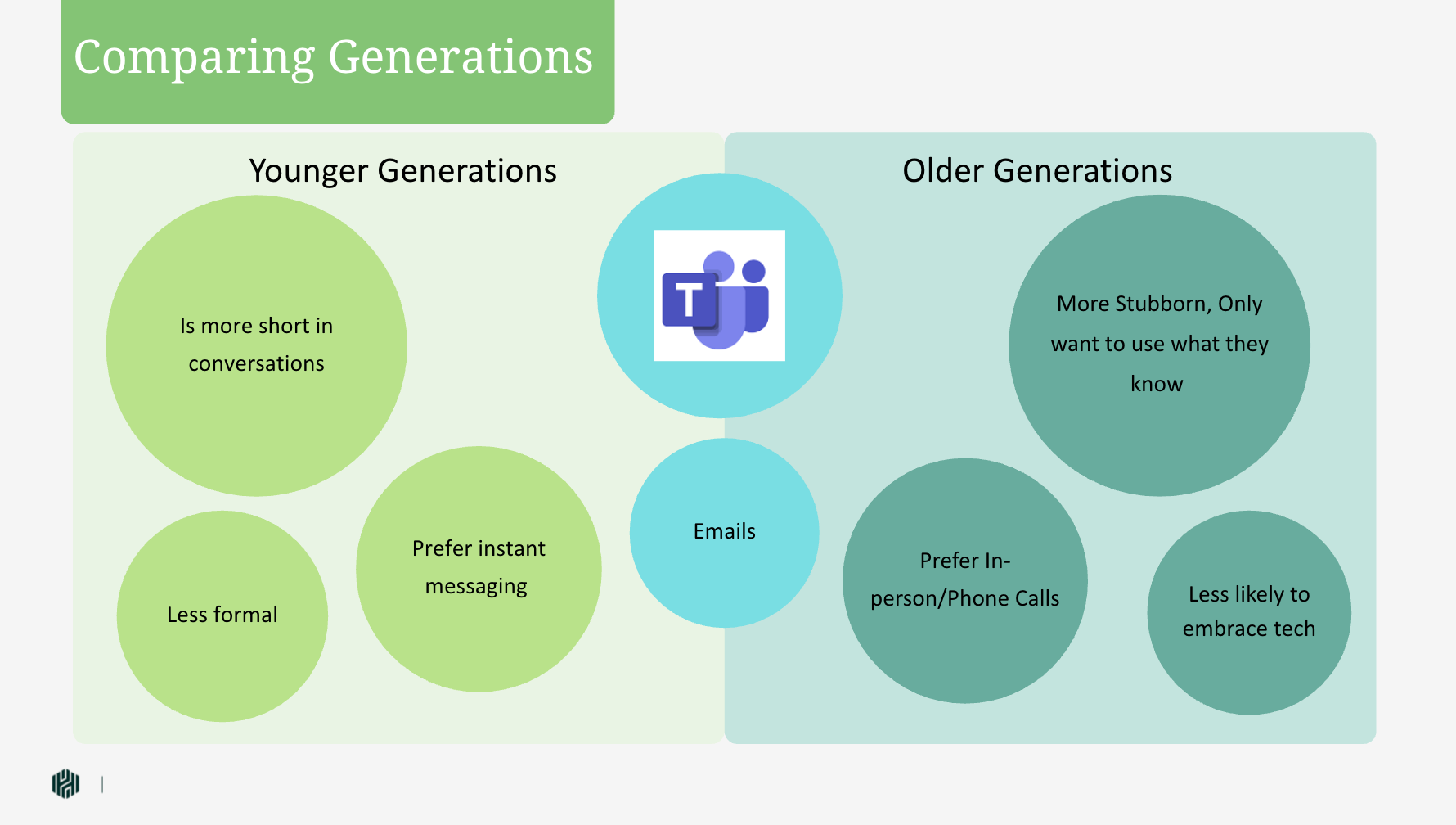 It's no secret that the different generations all have various styles of communication and often times this can lead to misunderstandings and confusion. In a survey of 42 office workers at The Marzetti Company, majority stated that communication style is the reason why generations misunderstand each other. Followed closely by differing tech use, then differing expectations, and finally not enough shared experiences, as seen in the Figure 4 below
