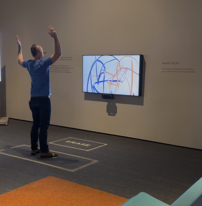 This space uses a variety of technology to engage the audience and create interaction between people and art. I was amazed with the activities in this room and had so much fun playing around with these technologies. There were a variety of ages playing with the technologies, both adults and children. I was able to witness the audience engagement and curiosity when exploring the exhibit. This is relevant for my capstone project because I was able to observe new interactive technology that was could be done with small movement. This is an important perspective when thinking about designing for a seated journey. I think these similar technologies could be implemented in the backseat, when children are limited with movement. I want to explore semi-stationary practices that use small movements as a tool of exploration.