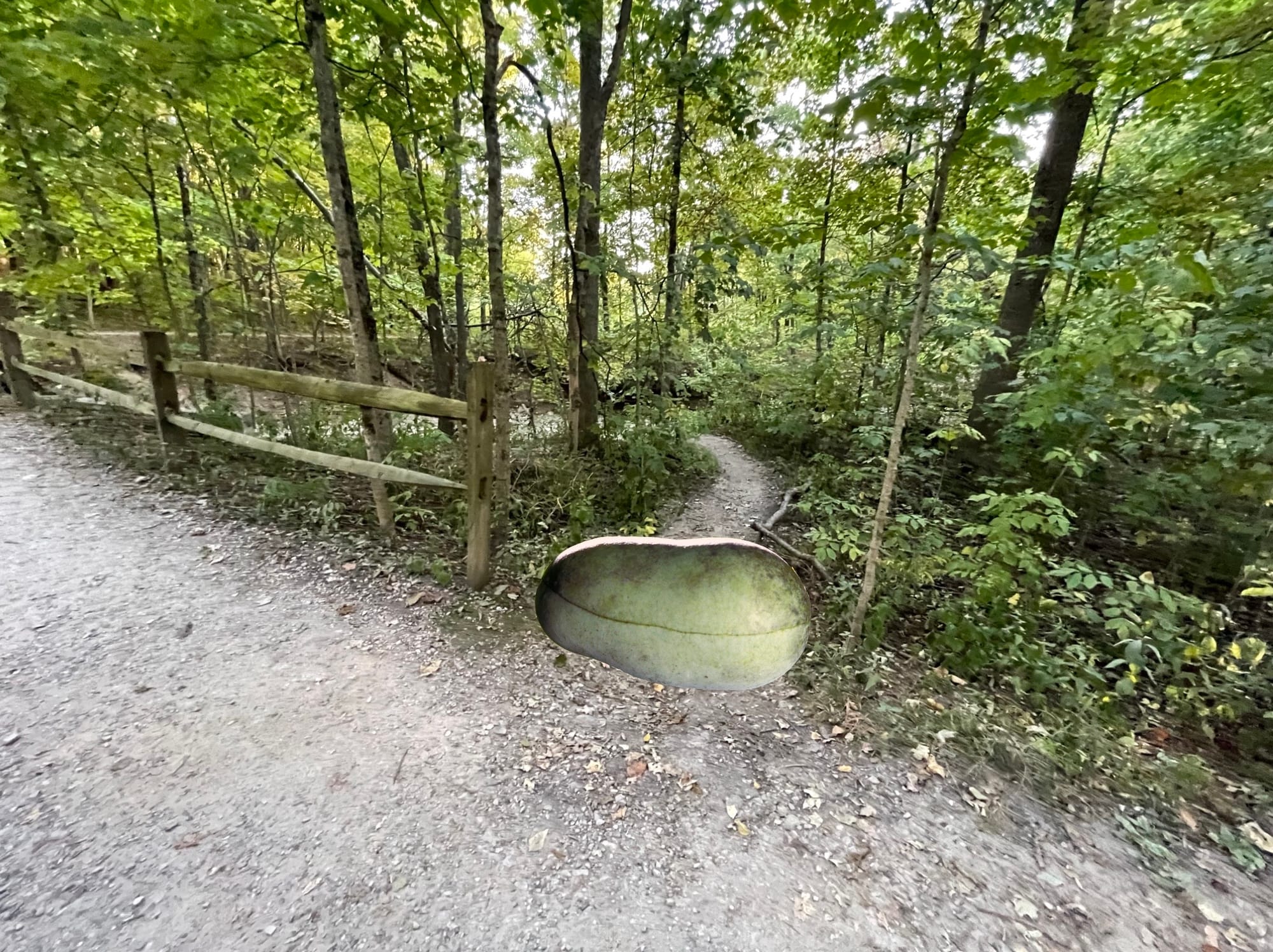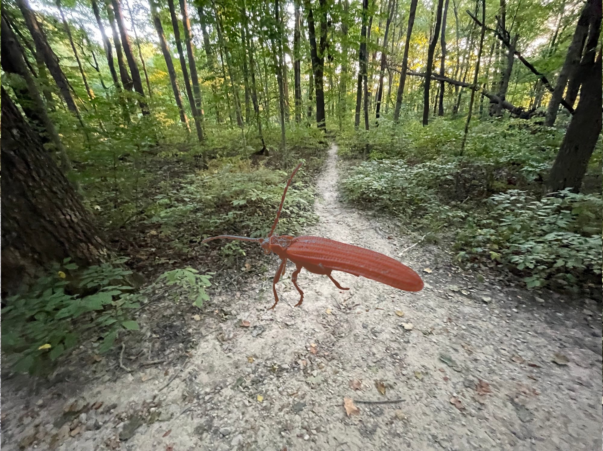 Below are photo edits of what this might look like with statues of the fourteen-spotted ladybug, golden net-winged beetle, and pawpaw fruit blocking the entrances to several user-created trails at Highbanks Metro Park.