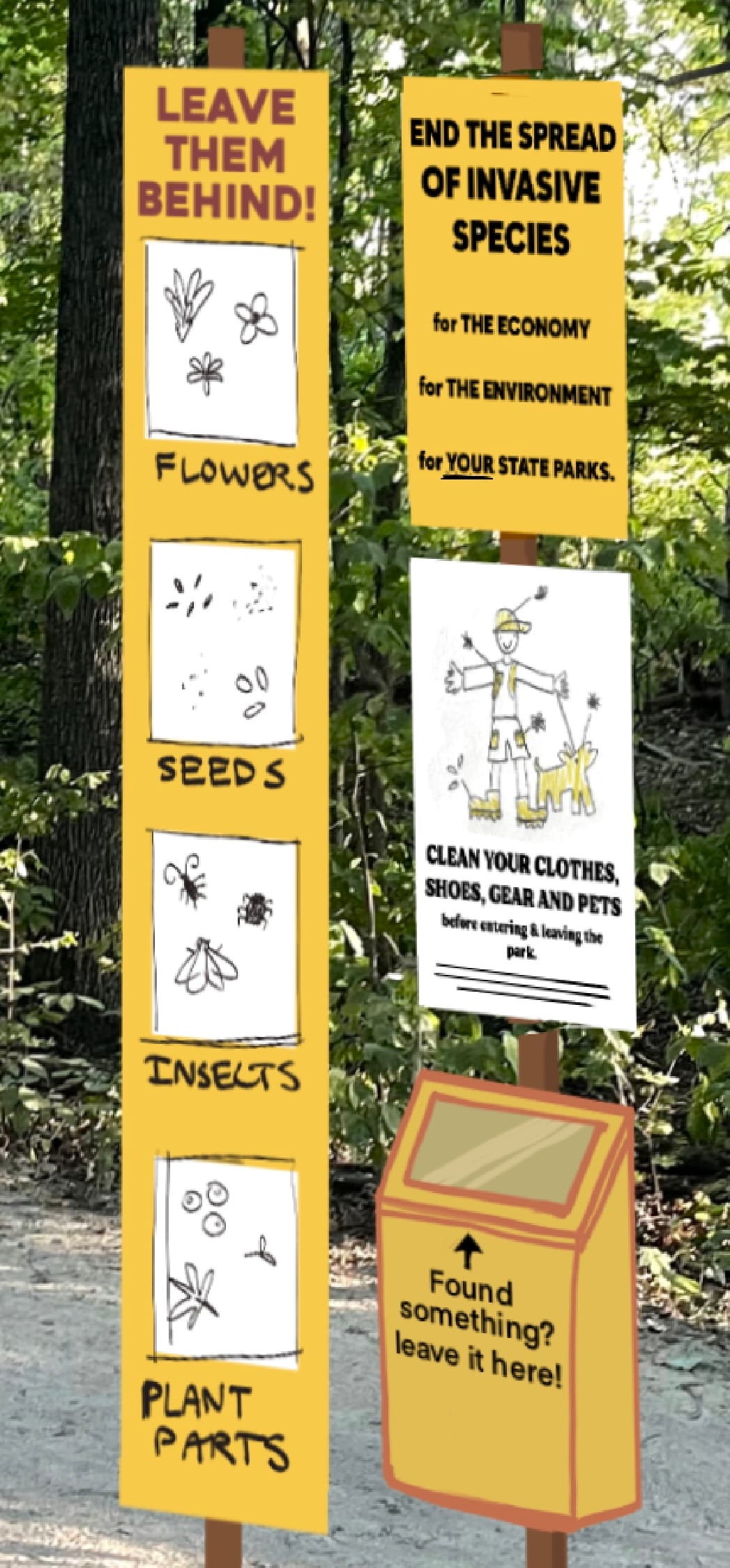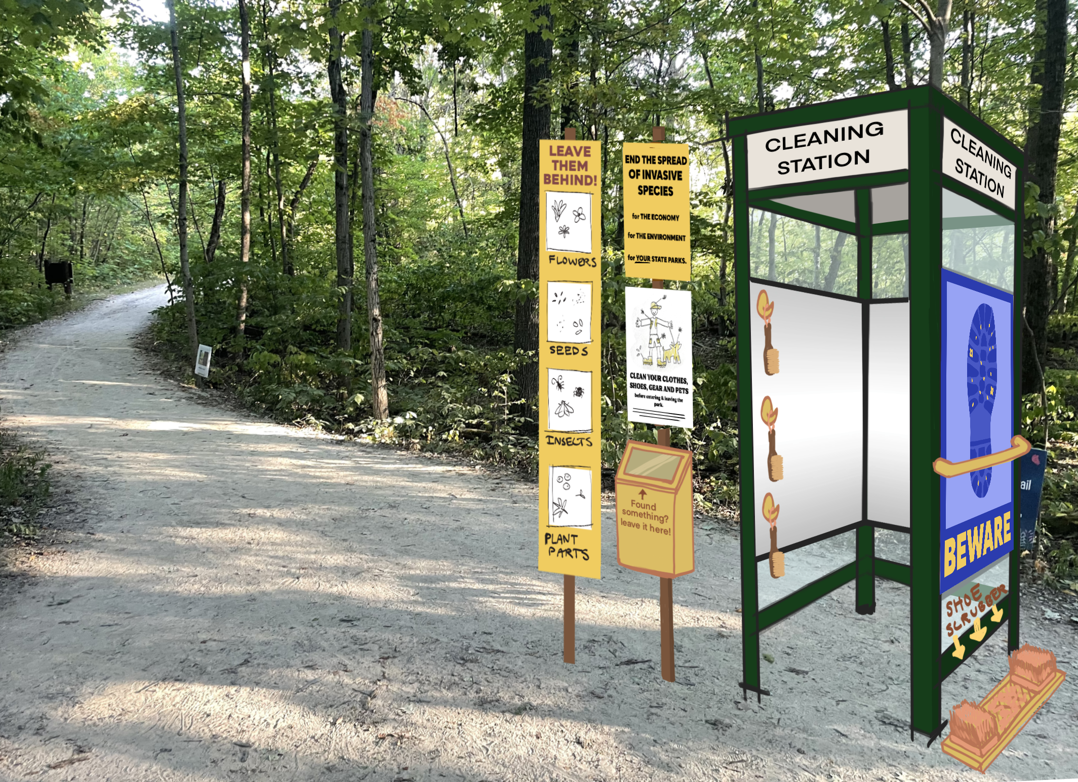 This conjecture is inspired by the York County Conservation District's guide to 'leave no trace' practices. A phone-booth style station would provide a spot to inspect your clothes and gear for any hitchhiking bugs, seeds, or plant parts. Three mirrors in the booth would allow for easier checking from all angles. Brushes would be provided for getting 'hitchhikers' off of clothing/gear and pets. A shoe scrubber with a handrail allow you to clean off your shoes. Signage would educate visitors on why it's important to clean clothes and gear and stop the spread of invasive species, show visuals of where to check for 'hitchhikers', and images of the types of 'hitchhikers' you should check for. A small box would be provided to place any plants/seeds/insects that you find on your person. On the outside of the booth, simple and eye-catching signs would illustrate where invasive 'hitchhikers' can hide, and warn you to "beware" of them.