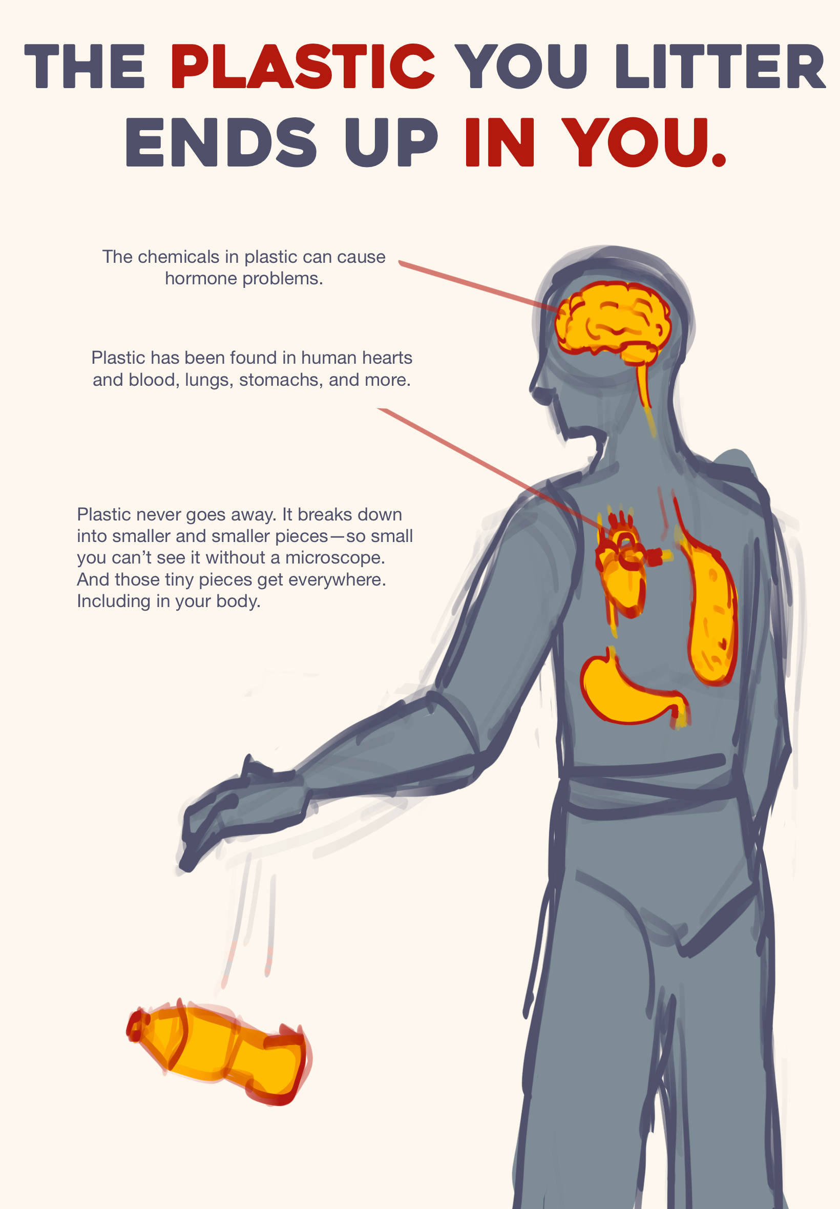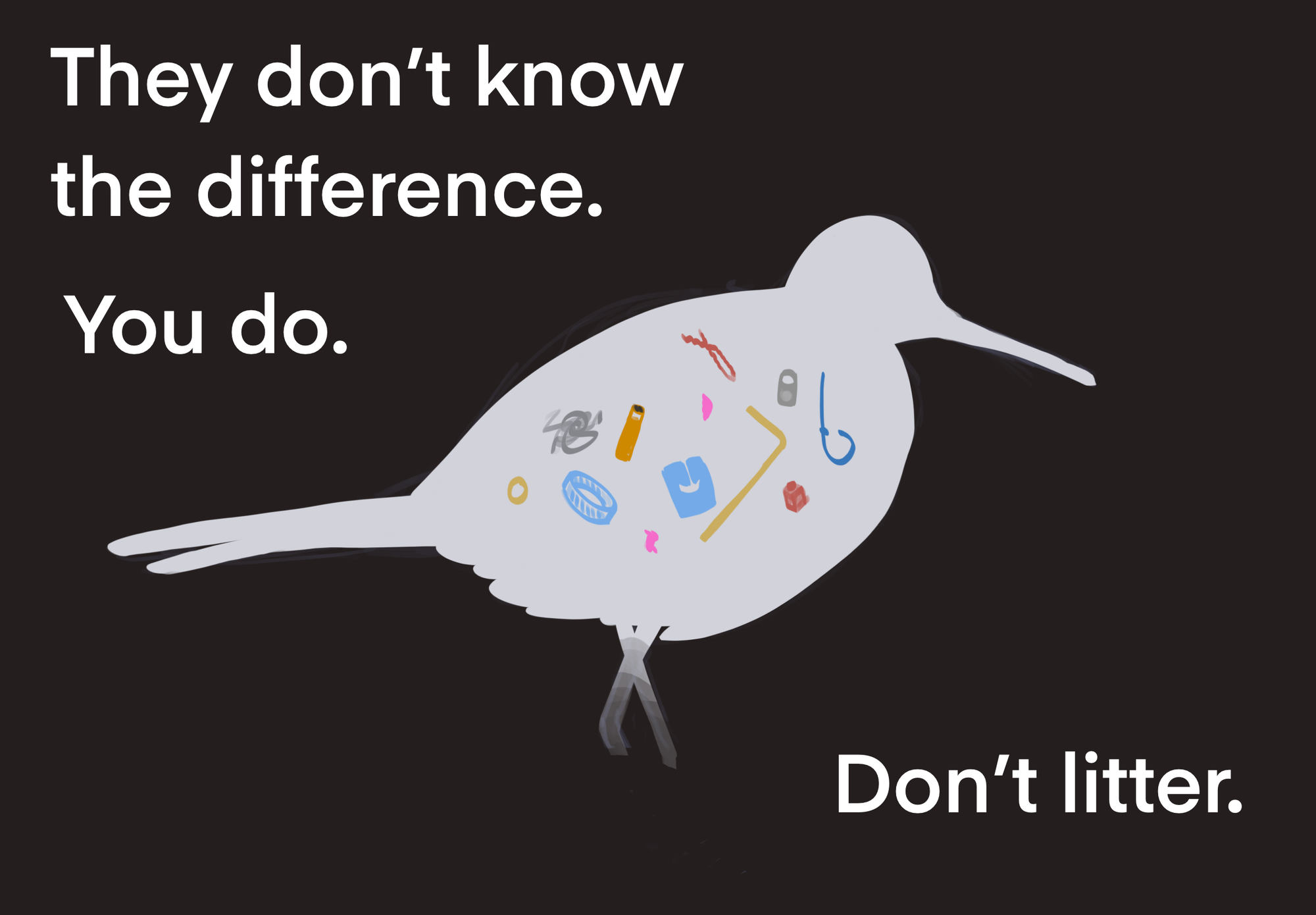 It's also not clear what each of the plastic/trash pieces are. If you make all the trash shades of red and also make "don't" or "litter" red, it might be more clear what's happening.