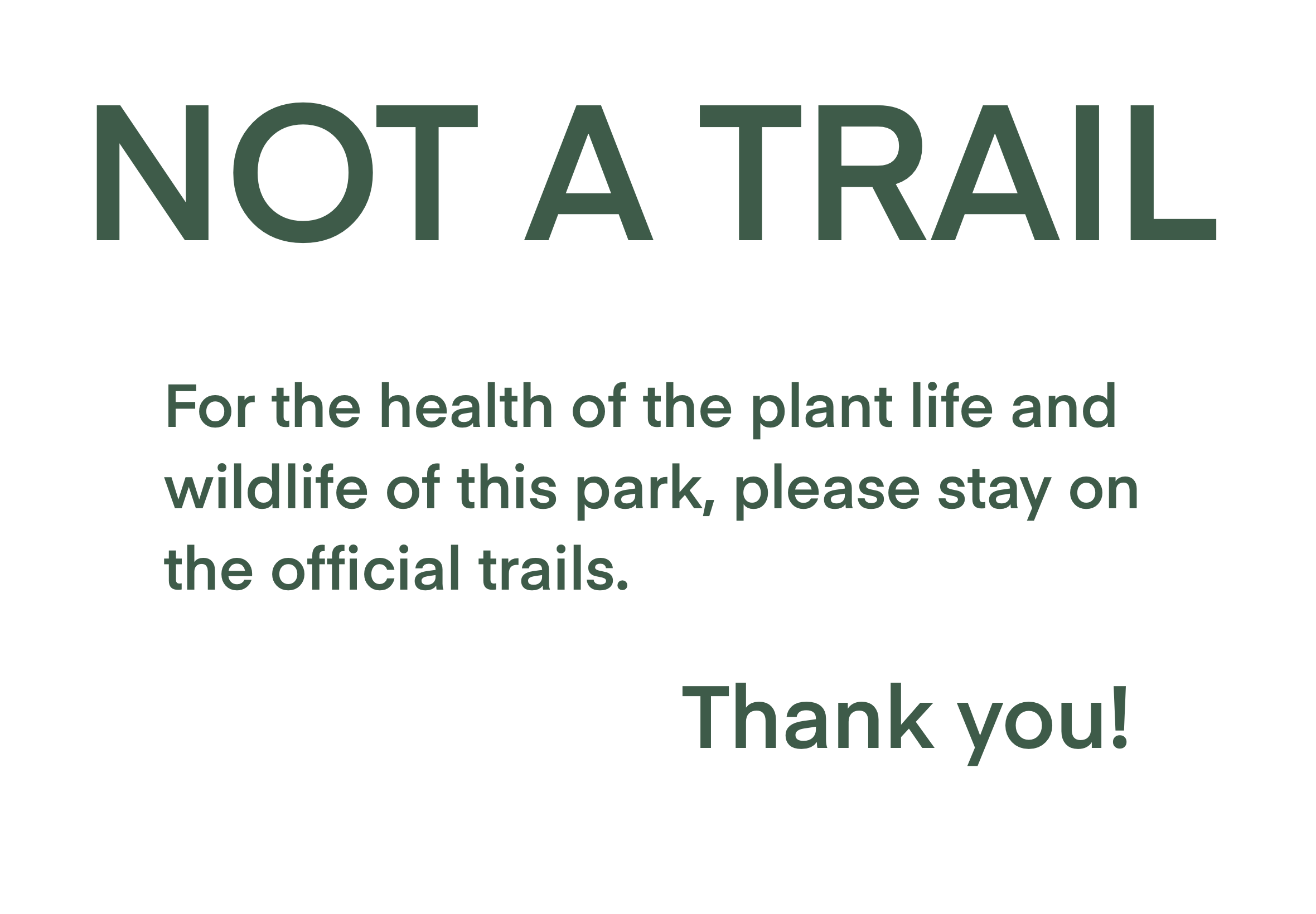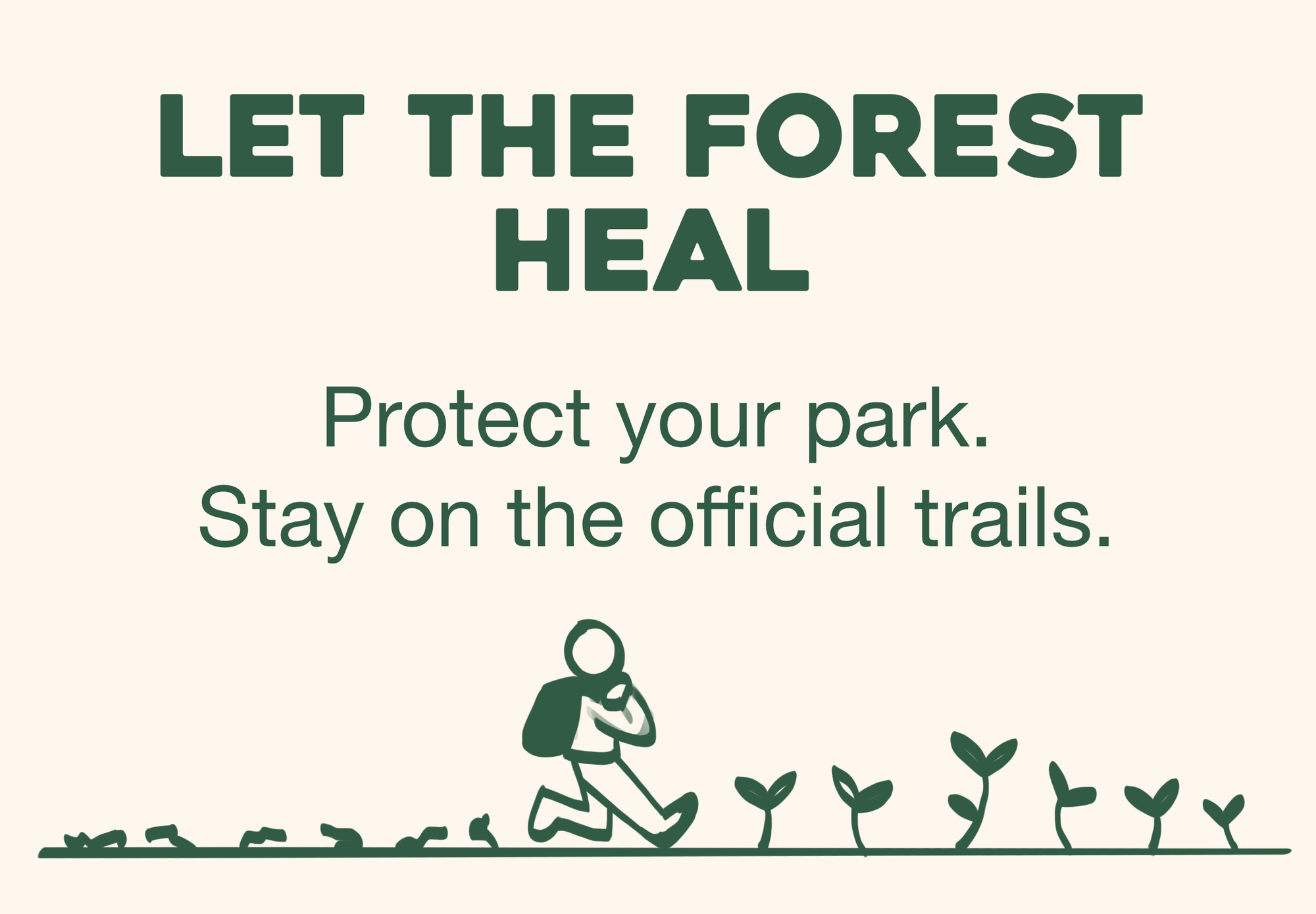 This conjecture consists of different signs that could be placed at state parks to discourage littering and encourage visitors to stay on official trails. While creating the signs, I tried to employ the techniques discussed in the paper by Rice et al. on graphic design in park signs (2023), including: typography as image, high contrast between background and text, scale shifts from headline to call-to-action, and 'rewarding' visitors who pay close attention with details or more information.