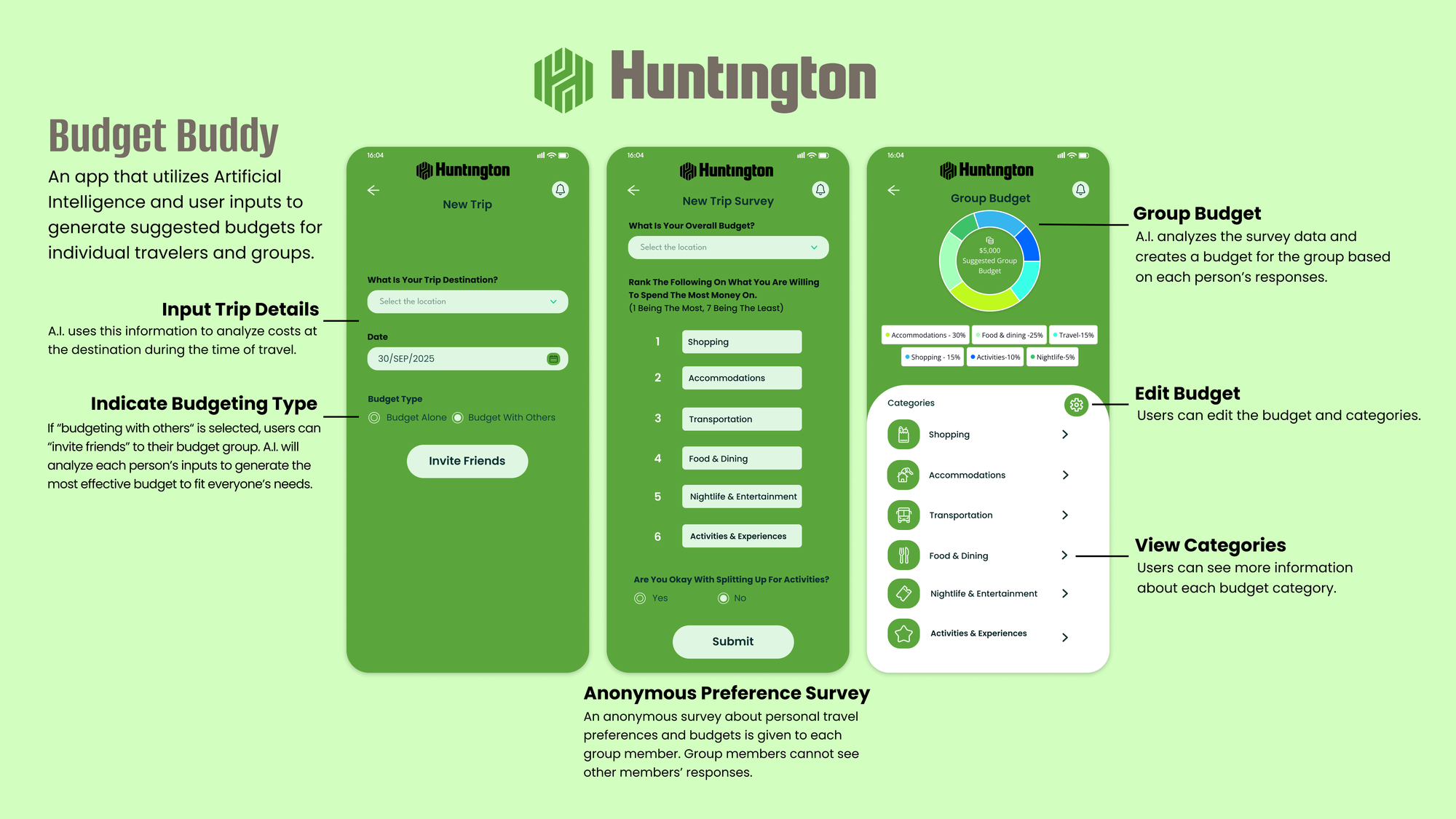 Certain aspects of “Budget Buddy” should be explored more, such as users who may not want to budget with their group, if users in a group don’t bank with Huntington, and how the group can track spending when users are on their trip.