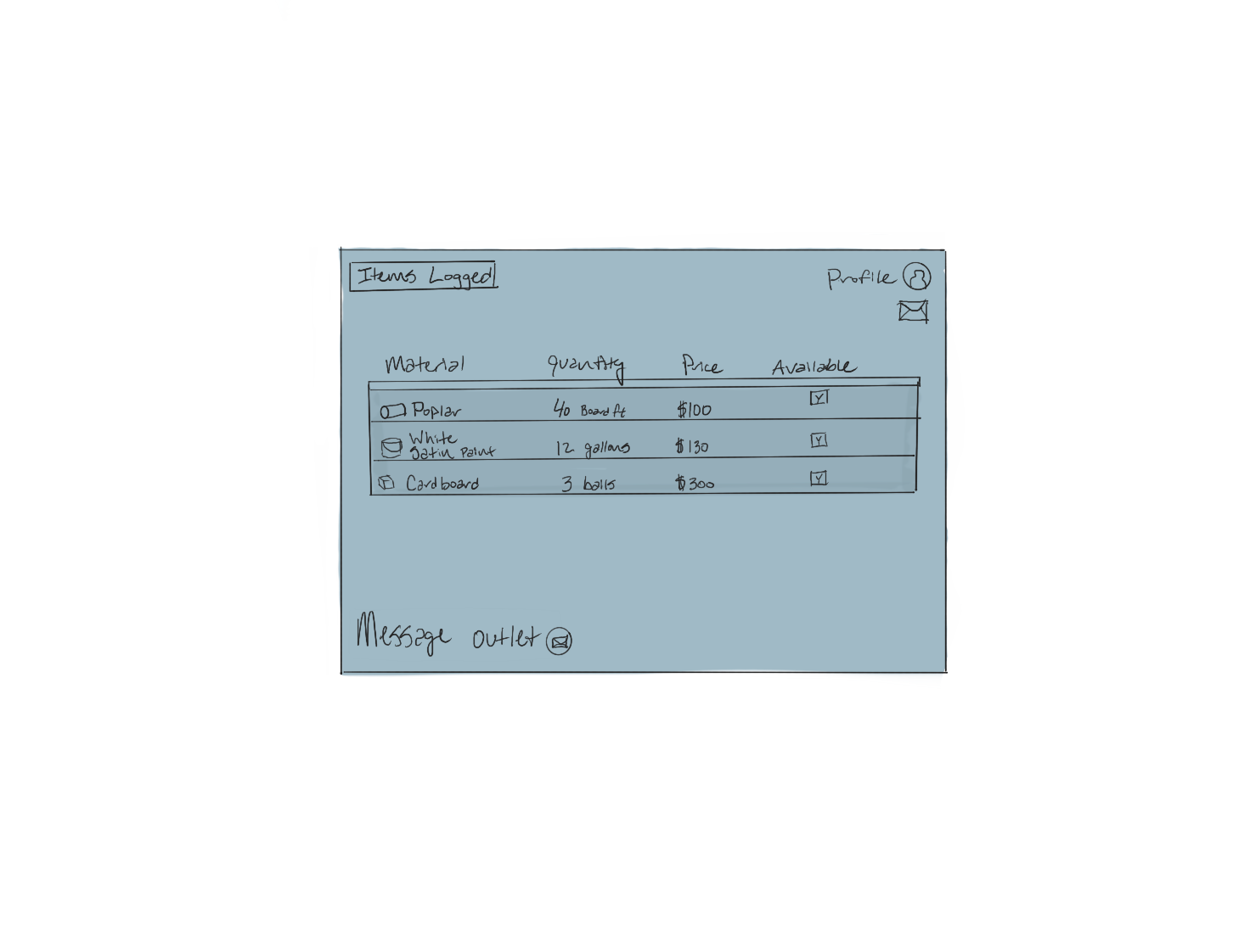 There would be a simple layout where the user could search a specific material that they are needing sourced. On the selling side, one would be able to see all of their listings and manage any messages directed their way.
