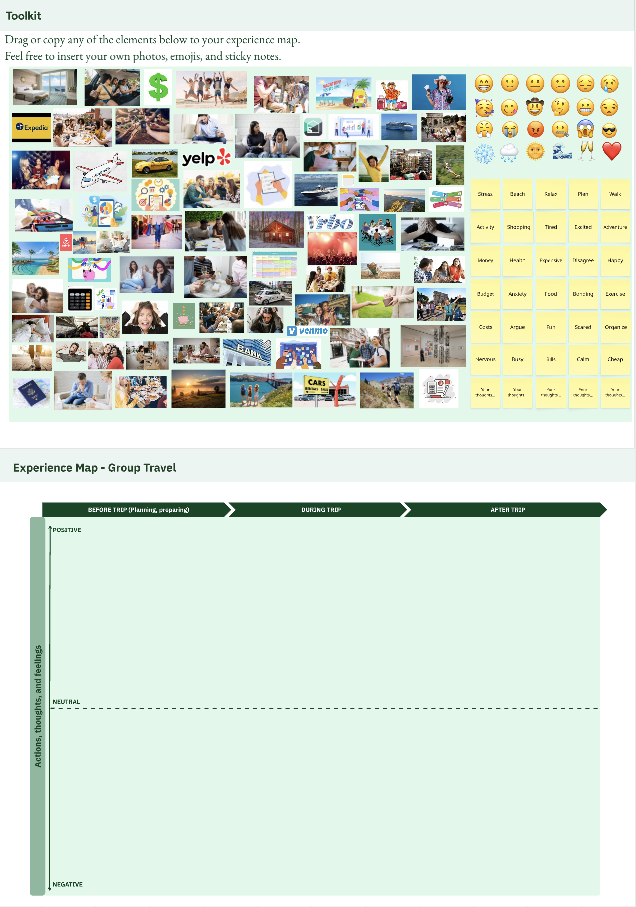 In the "Toolkit" below, you will find pre-selected images, words, and emojis that can help you describe your traveling experience. You will also find a timeline. The timeline is split into three phases: "Before Trip", "During Trip", and "After Trip". Everything above the line indicates a positive experience, and everything below the line is negative. The higher up you go, the more positive it is. And the lower down you go, the more negative it is.