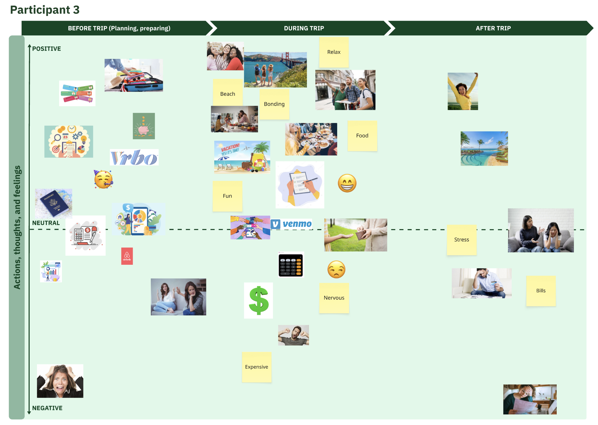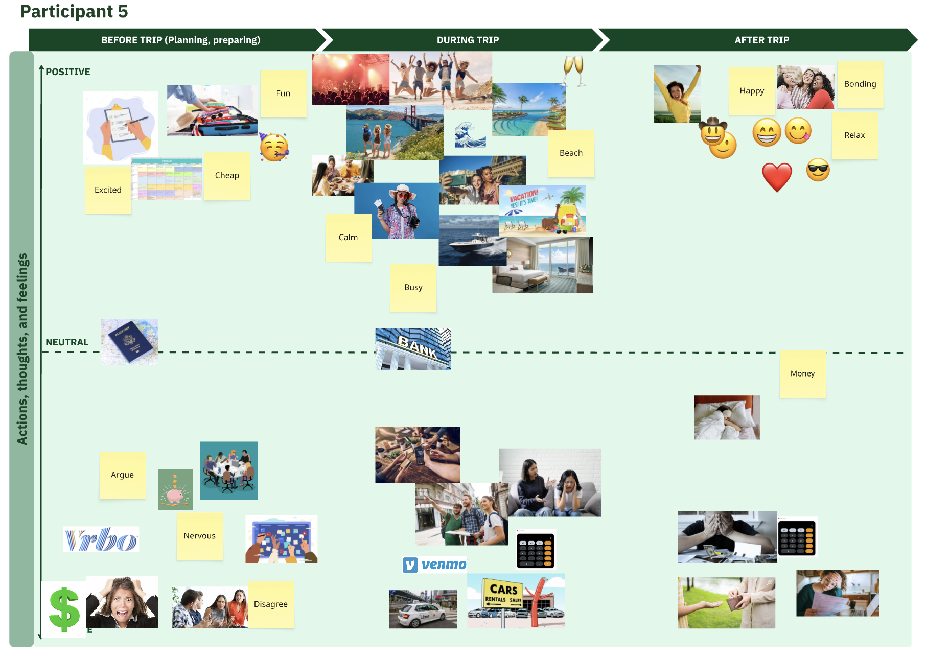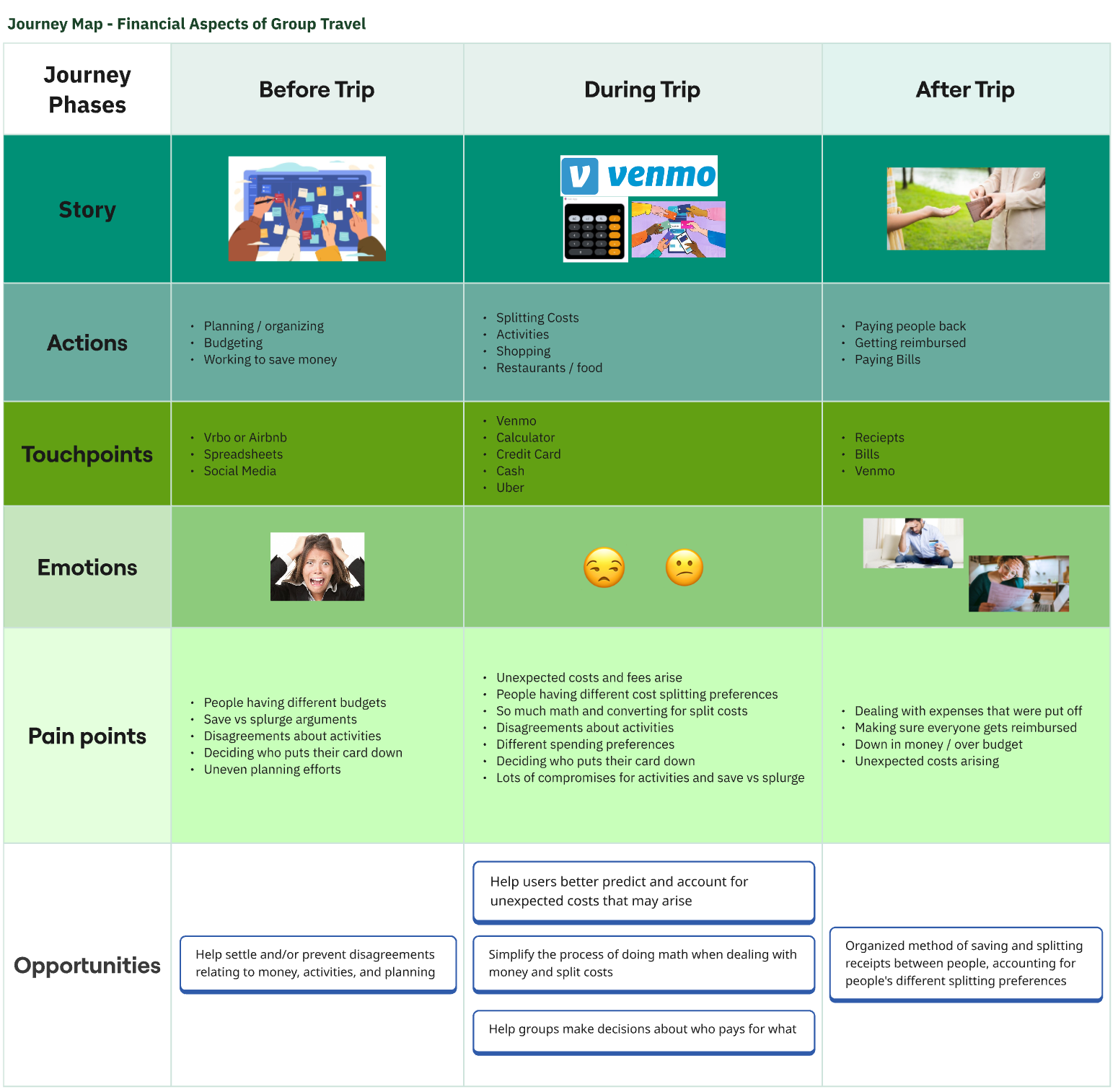 Next, I created a journey map including the most common experiences, actions, touchpoints, emotions, and pain points relating to the financial aspects of group travel.