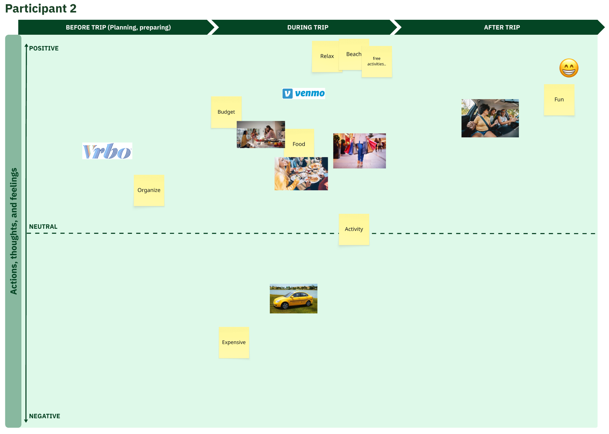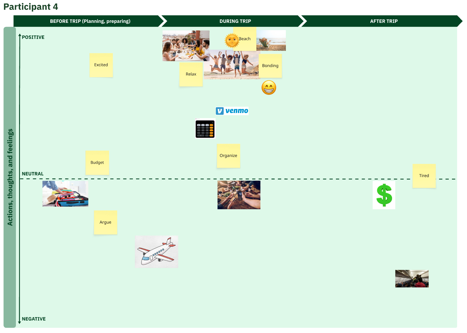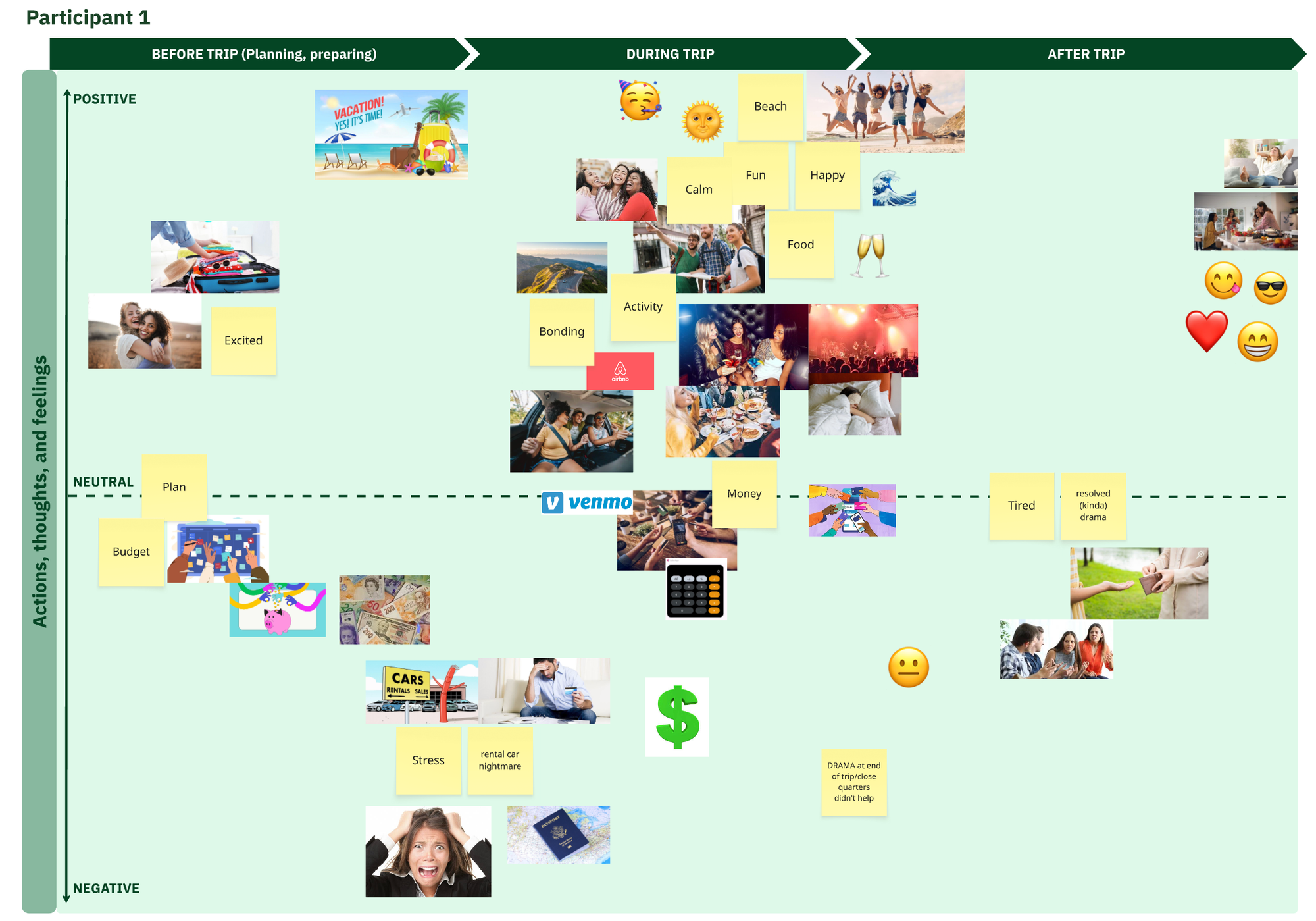Next, I created a journey map including the most common experiences, actions, touchpoints, emotions, and pain points relating to the financial aspects of group travel.