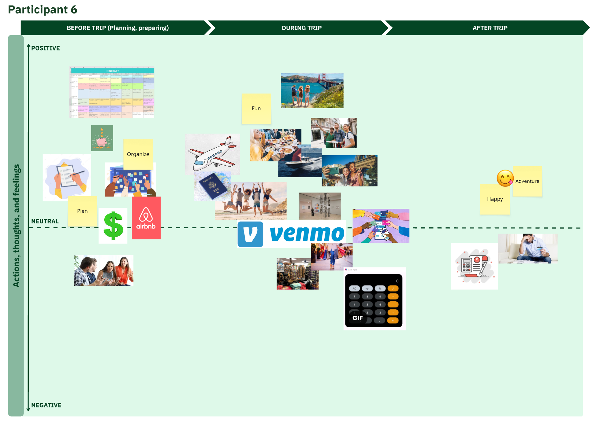 I conducted Individual Experience Mapping and interview sessions with 6 of my survey respondents. From these combined research methods, I aimed to gain insight into the areas of the group traveling process people find most challenging and stressful, from planning to traveling, to after the trip. Participants were instructed to map a recent group travel experience from before the trip to after, so I could decipher which areas of the group traveling process people find challenging and why.