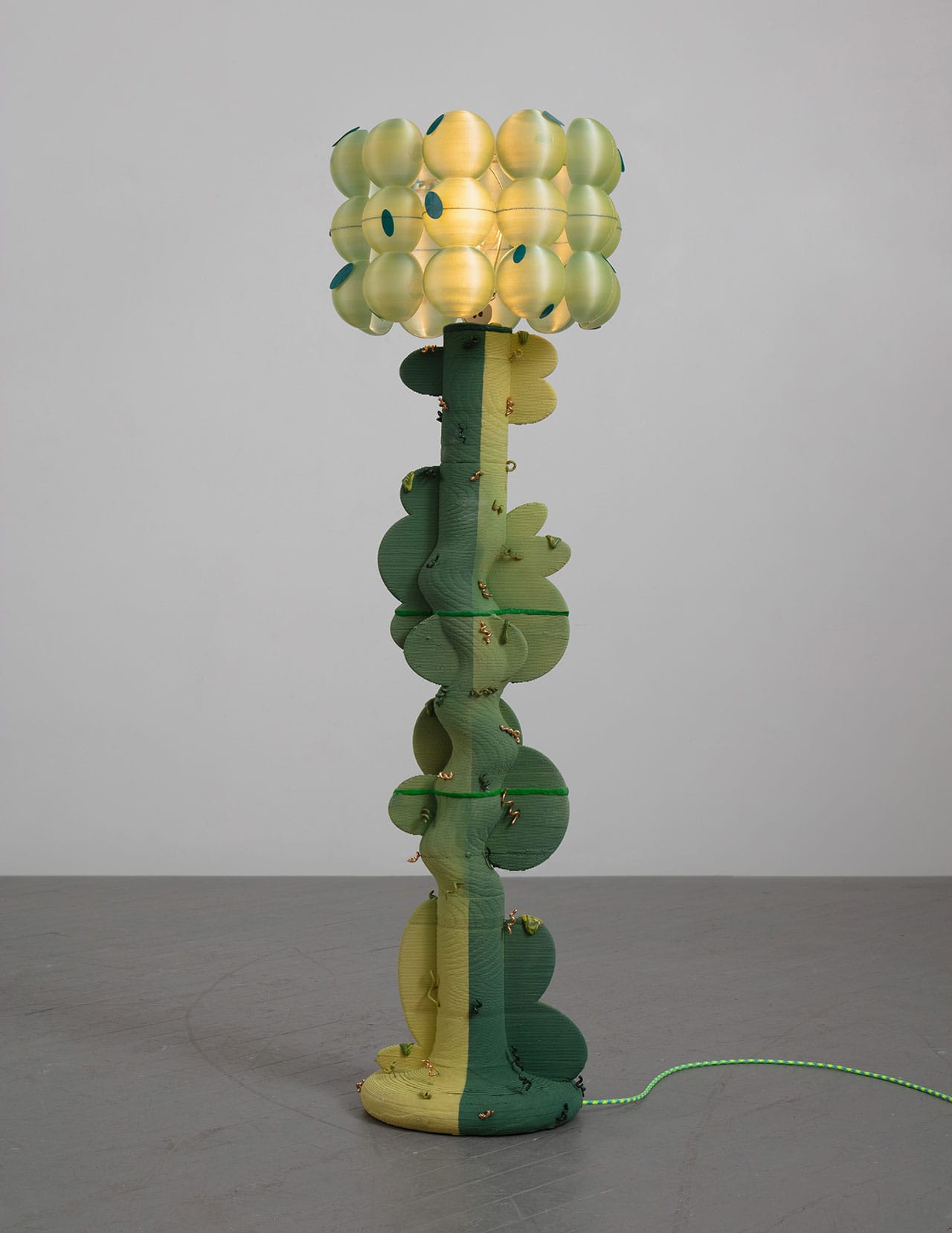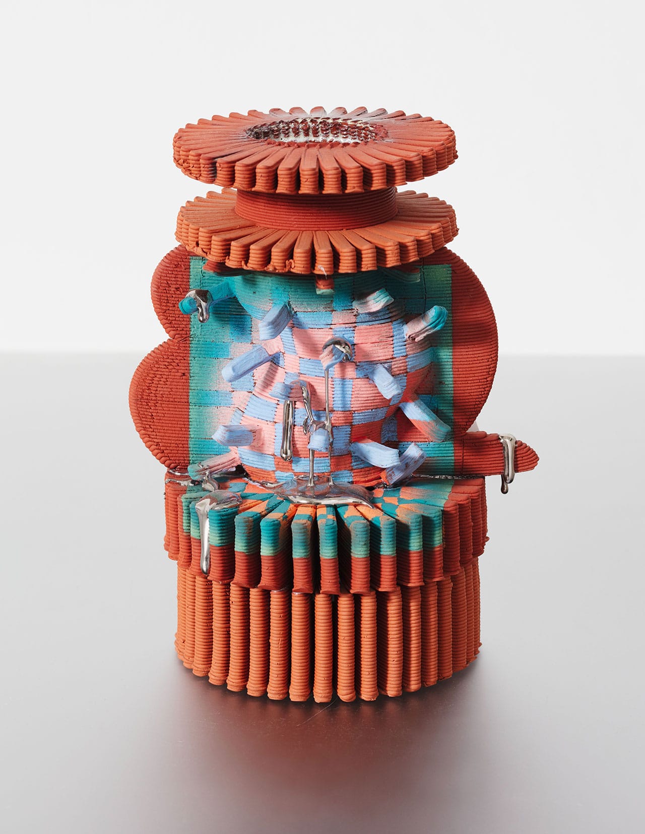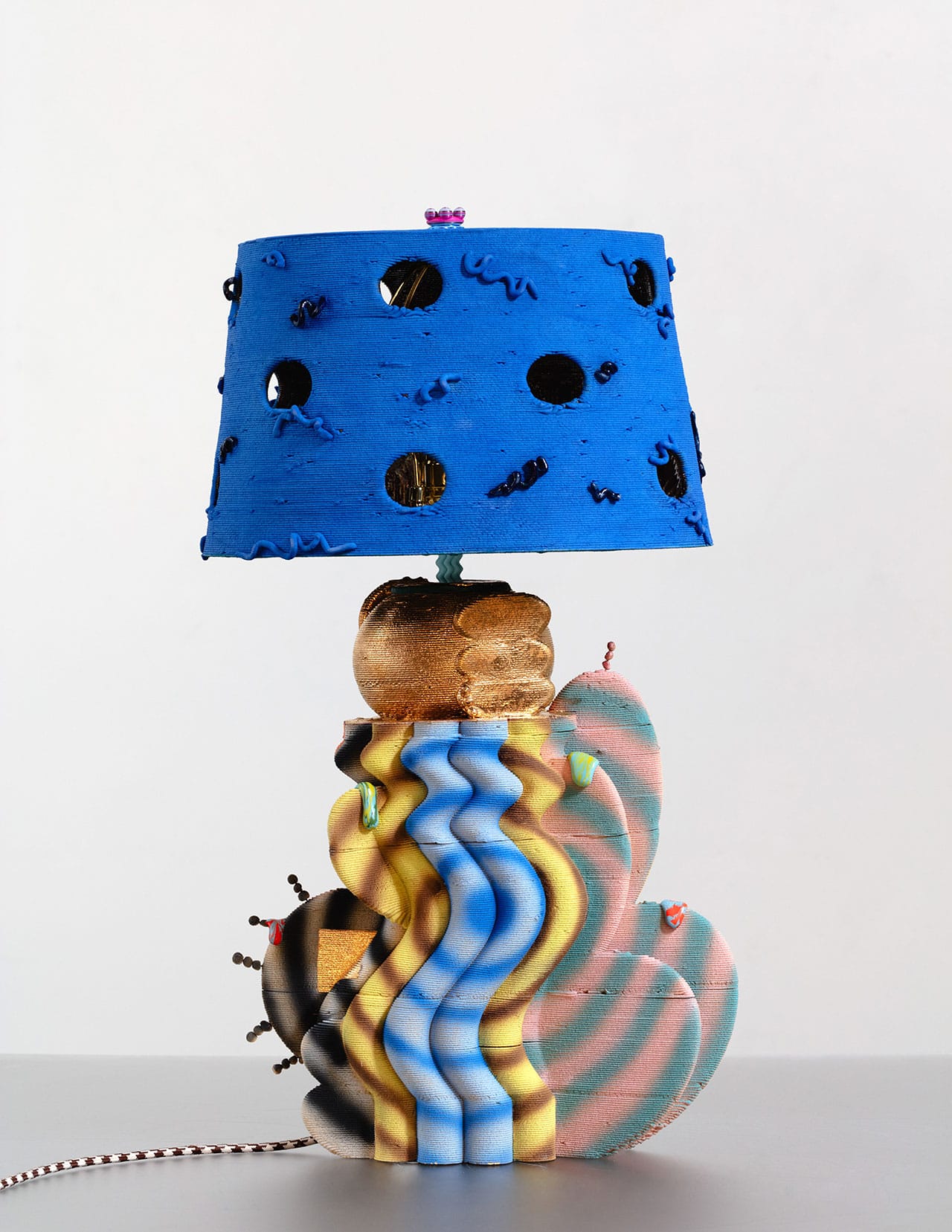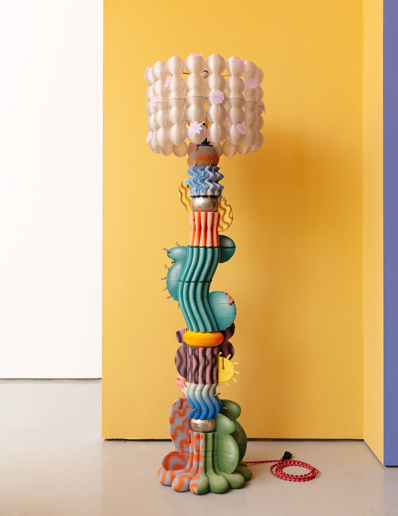 Ngo blends 3D-printing technology with hand-painted imagery influenced by the digital aesthetics of her childhood, as seen in Minecraft and The Sims. A Vietnamese-American creative, she also references her heritage. Faceted forms echo the look of traditional silk lanterns, while layered textures recall the topographic views of rice paddies. (Zappia)