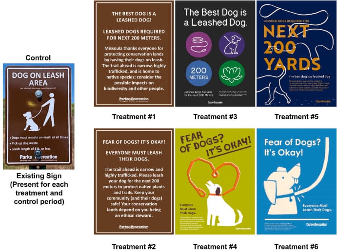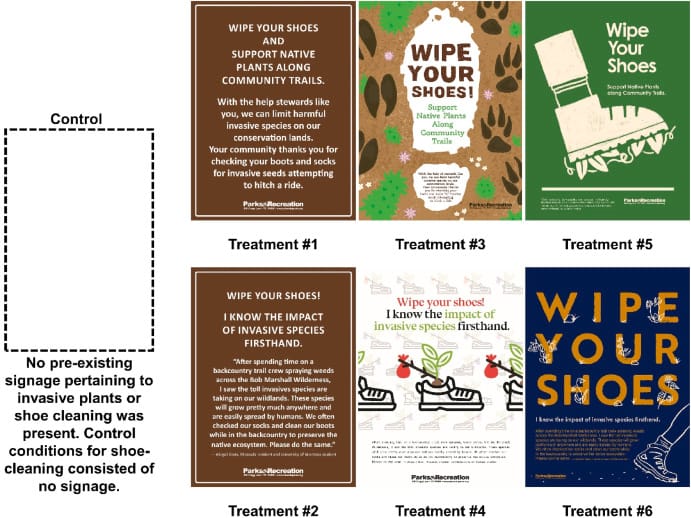 This exploratory research sought to answer the following research questions: 1) Does graphic design influence visitor attention capture in park and protected area signage? 2) Does graphic design influence visitor behavior through park and protected area signage? This study employed an experimental design of 6 signage-treatments incorporating diverse graphic design elements to address two separate management issues—dogs-off-leash and the spread of invasive plant species—at a popular trailhead in Missoula, MT. Results show that both administrative and graphic design signage treatments promoting shoe-cleaning to stop the spread of invasive species proved effective in capturing attention of visitors, suggesting that managers should incorporate both attractive and authoritative elements in park messaging. In regards to influencing visitor behavior, two design treatments incorporating high color-contrast, large “scale” shift and “typography as image” elements proved the most effective for both management issues. These findings indicate that graphic design encapsulating persuasive language is very important to capture visitor attention and influence behavior, and design elements should be considered seriously by park managers when employing various communication strategies.