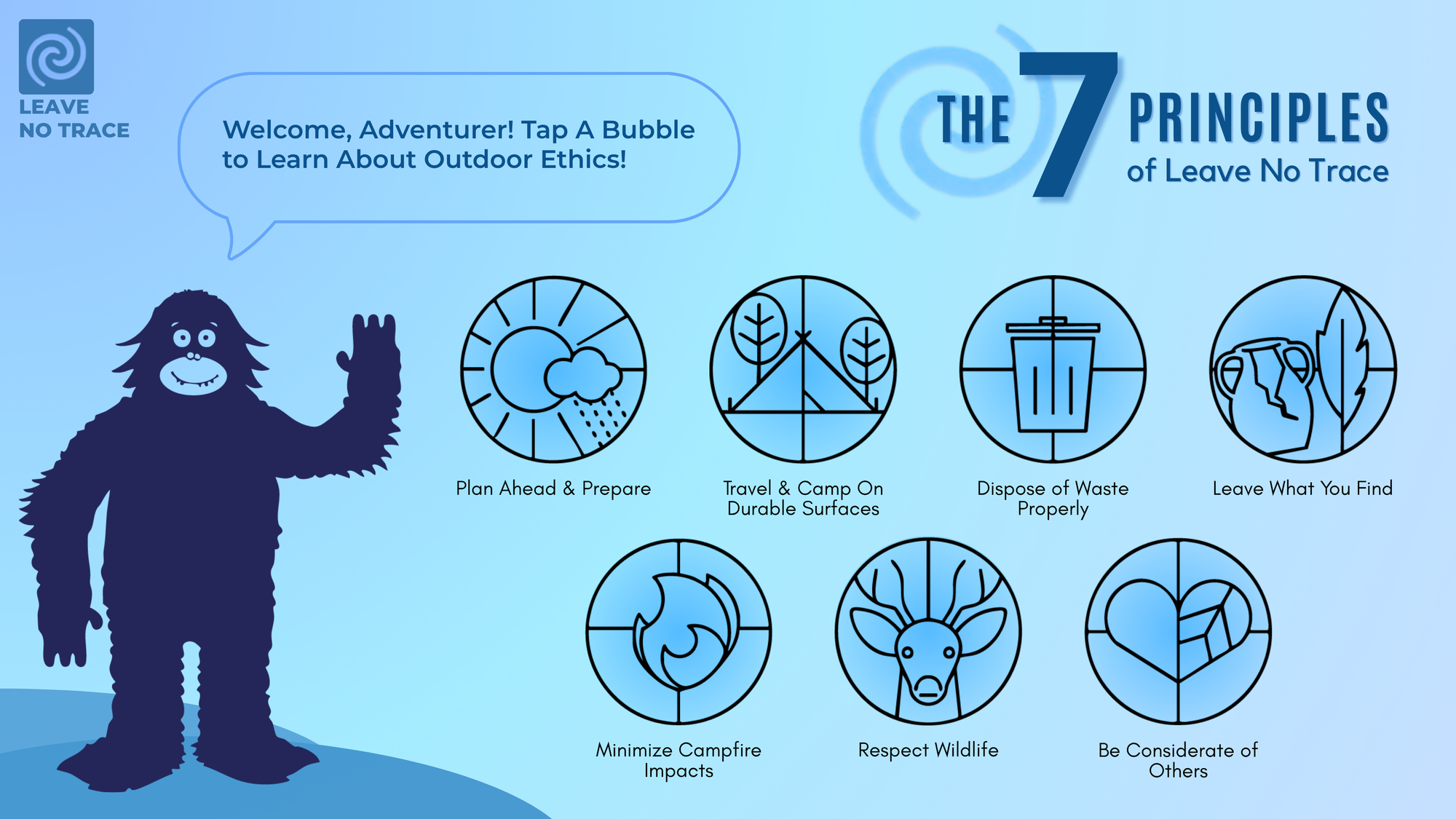 The interactive experience illustrated above draws from the existing Leave No Trace outdoor ethics cards and Seven Principles webpage, as discussed in Leave No Trace: Outdoor Ethics, to create an immersive installation that educates park goers in a more engaging way. Using projectors, motion-activated sensors, and Augmented Reality techniques (similar to the immersive exhibits featured at Otherworld), this idea aims to make learning about outdoor ethics a memorable, engaging, and fun experience. The friendly Bigfoot from the original Leave No Trace ethics cards is used as a character to guide participants through the experience, and the personified outdoor equipment from the kid's ethics deck could be implemented as well. The installation could manifest as an immersion room built into park visitor centers.
