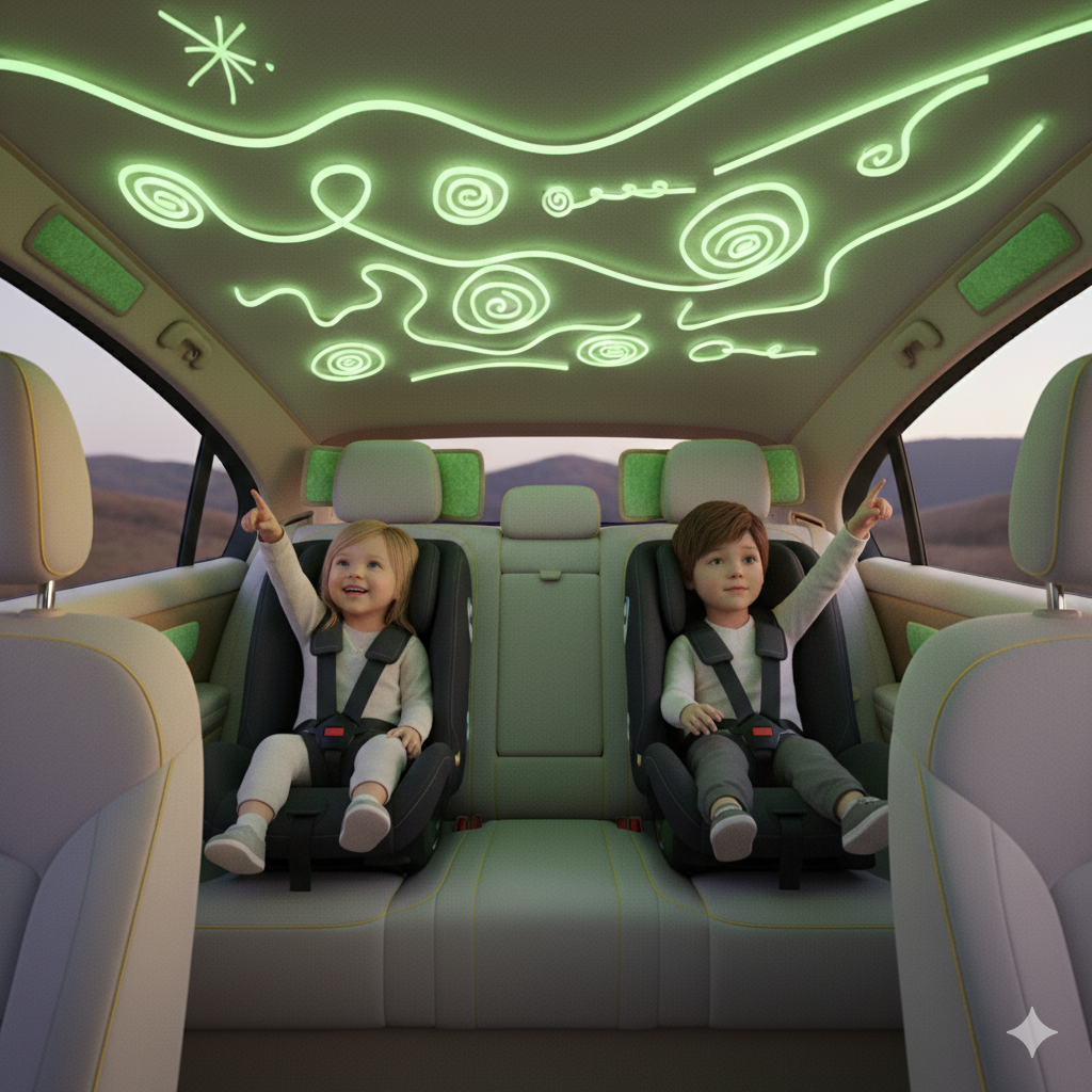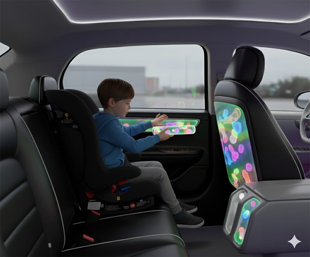 Insights from Science & Technology reveal that some of the most promising innovations come from where design meets science. According to Bergstrom, C. (2022) mindful breathing techniques activate the parasympathetic nervous system reducing heart rate and stress. Cars could integrate gentle visual or tactile cues like pulsing lights or soft vibrations to guide children into calmer breathing patterns. Designing Calm: The Role of Geometric Shapes, talks about emotional responses to shapes are rooted in human psychology and evolutionary biology; It explains that curves are often associated with feelings of safety, calmness, and comfort. This can suggest that light projections or simple animations on the car ceiling could help children drift toward calmness. Maybe something that isn’t distracting for the driver but some soothing visuals that can pair up with some audio to distract children into calming down. I also looked at PEMF(pulsed electromagnetic field) therapy. which uses electromagnetic waves to influence brainwaves. When used in conjunction with meditation, PEMF devices can encourage states of relaxation and focus by inducing specific frequencies of brainwave activity. This is a really interesting topic but parents hesitate to expose their children to this technology. Screens are everywhere in this day and age and though controversial everyone uses them. The key is balance and systems that help parents manage screen time can help without overstimulating a child. Below is an idea that can have an engaging screen across the roof that shows calming visuals and audio.
