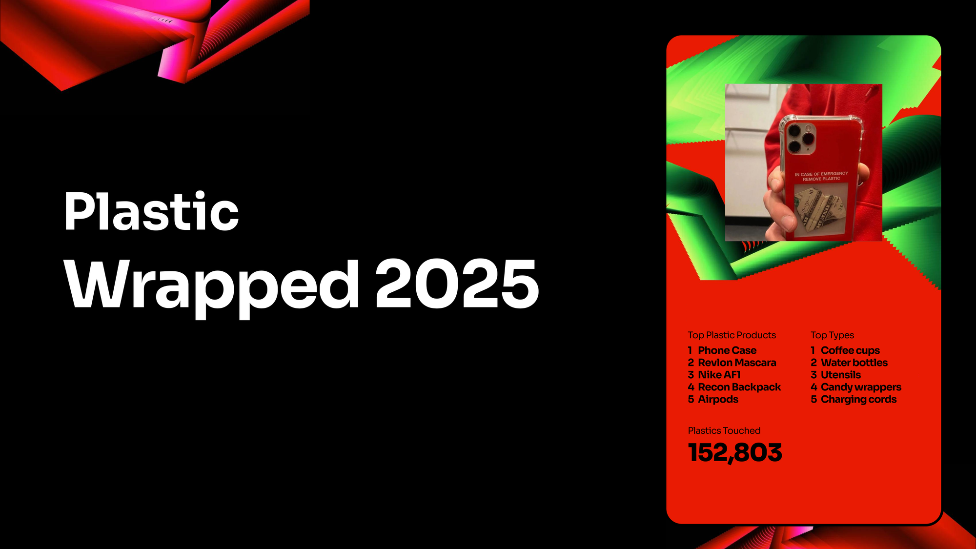 Plastic Wrapped, like Spotify Wrapped, tracks your plastic usage over time and allows you to compare your data with other people to better understand how social differences contribute to experiences on plastic. I created it with the hope that it could allow users to reflect on their own plastic consumption and how consumerism affects their day to day lives.