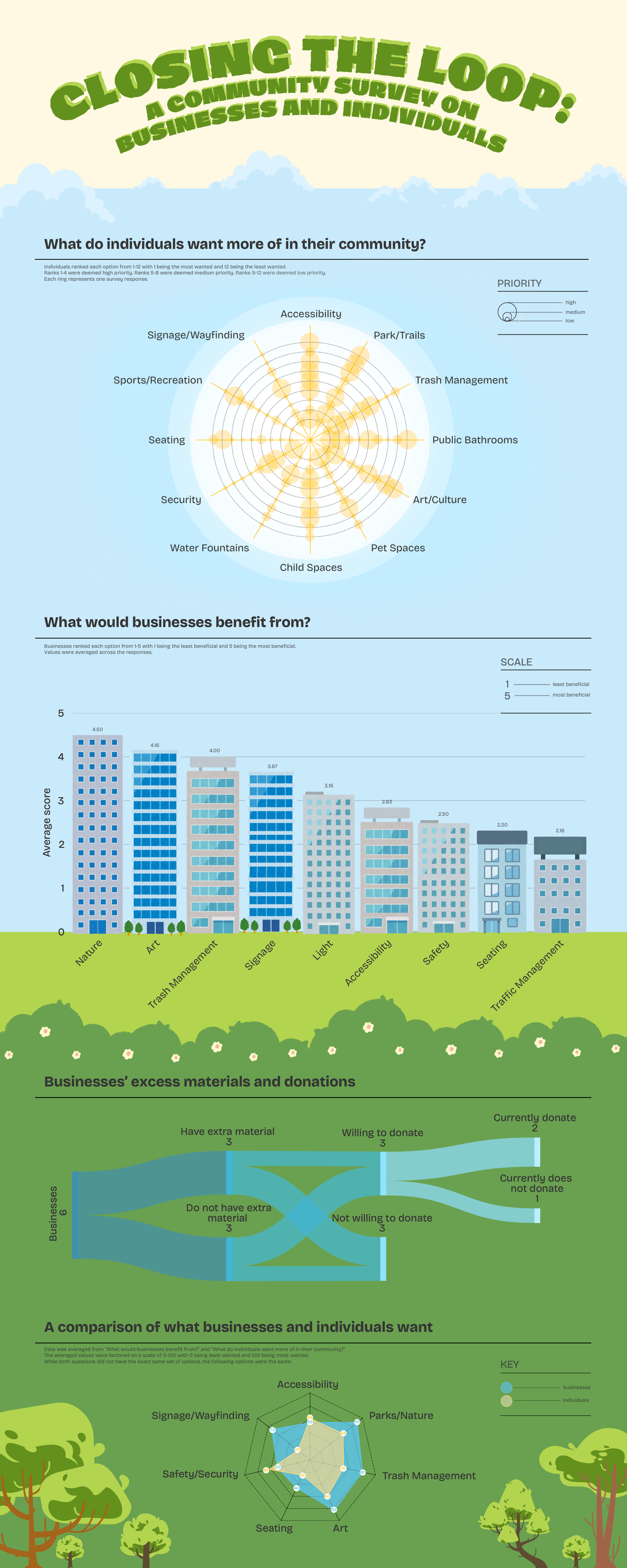 - Businesses and individuals both want more nature, art, and trash management in their community.
