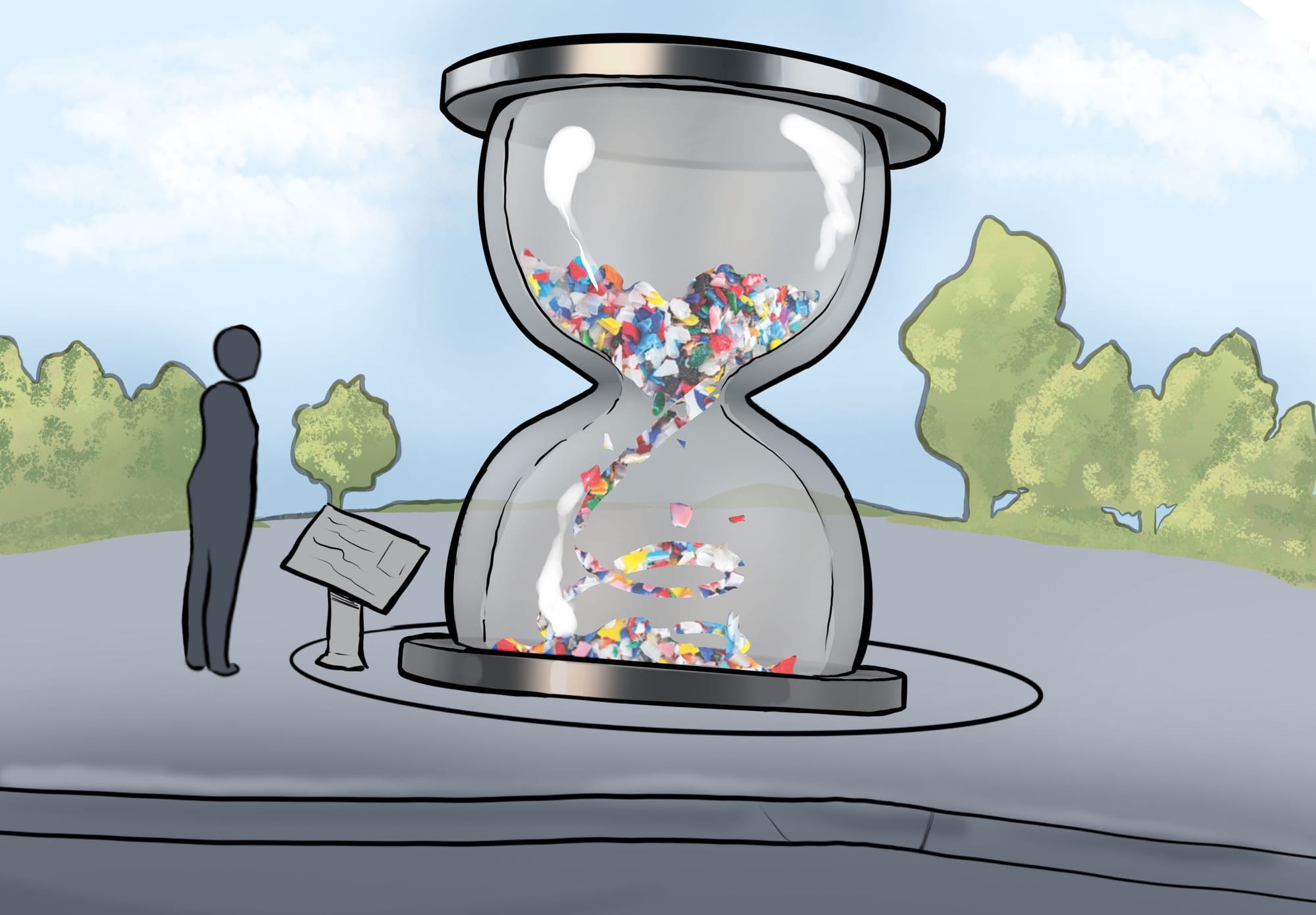 Concept two is a public art installation that functions as a tool for education on microplastics, littering, and recycling options. The visual and emotional storytelling would raise awareness and drive community change.