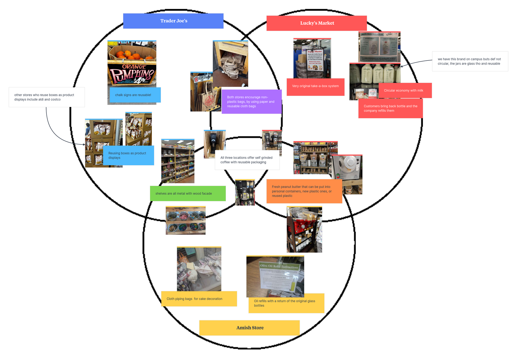 Three other site visits looked out for more of these unique community systems in grocery stores. Trader Joe’s boasts unique blackboard and cardboard signage that limits plastic. Lucky’s participation in a milk bottle return program with Hartzler’s Dairy stood out as a strong example of practical circularity. The Walnut creek visits revealed unique building blocks of their community that directly affected materiality.