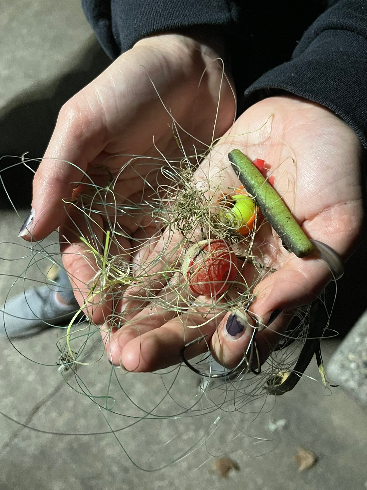 When it comes to waste, the two main factors stated by Heather and Tracey were angler waste and marine debris. Angler waste comes from improper disposal of fishing gear. During a night walk through a trail at Alum Creek campgrounds, many fishing lines, hooks and weights were found around small ponds. Despite the park providing small bin posts to dispose of angler waste, a lot of angler waste was found outside of the bin while regular waste such as napkins or wrappers were found in the angler waste bins instead.