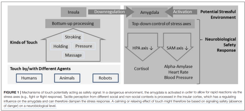 “Tactile perception from different social and non-social contexts is processed in the insular cortex, which has a regulating influence on the amygdala and can therefore dampen the stress response. A calming or relaxing effect of touch might therefore be based on signaling safety (absence of danger) on a neurobiological level.” (Eckstein, Mamaev, Ditzen, & Sailer, 2020)