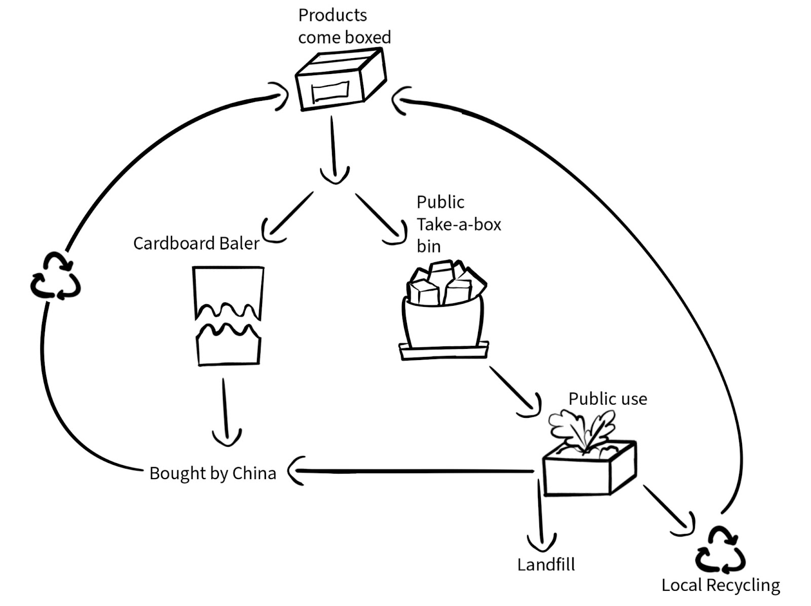 Boxes are generated from shipping in products, and these mostly go to the in-house cardboard baler. The condensed cardboard is bought by Chinese companies and eventually used to make boxes for American products. But there is another offshoot created by the unique take-a-box system where customers can take boxes, often for carrying groceries home, storing plant materials, moving, or anything else. The boxes from this branch have a wider reach, but presumably some are locally, or globally recycled, while many may end up in a landfill. Despite all the offshooting branches to this system, there is still a slight circularity emerging.