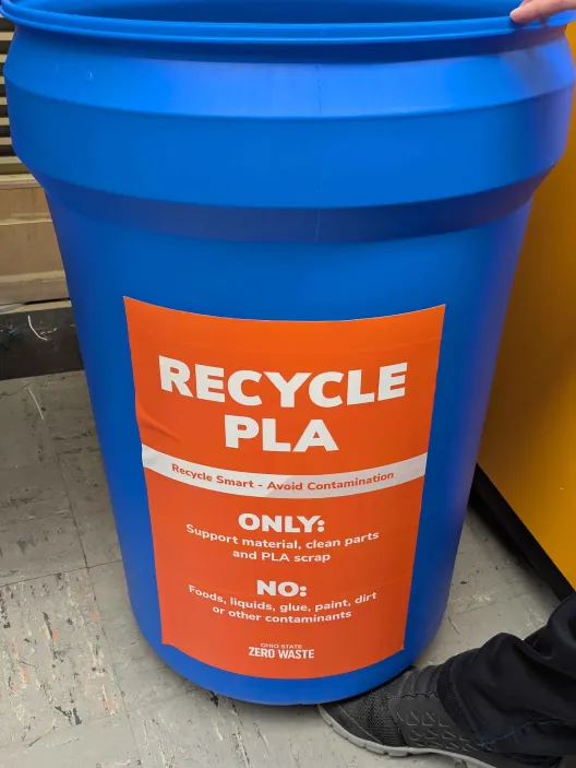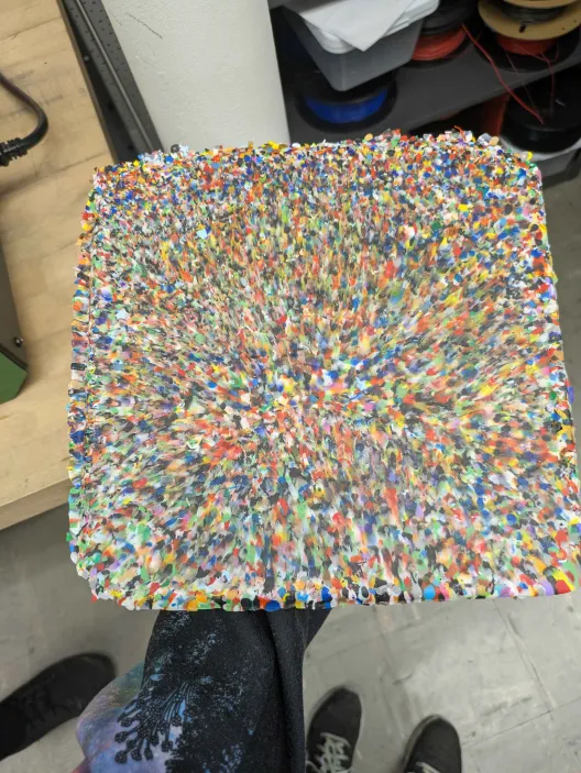 Our team visited CDME, the Center for Design and Manufacturing Excellence, to see how a local Laboratory Coordinator is trying to tackle the PLA waste issue. Lili Hurst has reached out to many schools and libraries in the area that would potentially have a waste stream. To then set up a collection system and utilize the machines at the facility to shred and process the spent PLA. During our tour she showed us the 3D printing room where she has been experimenting extruding the pelletized and shredded pieces in the hopes of creating new 3D printing filament. That process is proving to be difficult due to the brittle state of the material and the tolerances needed on the printers, but pressing the shreds into sheets is demonstrating to be more successful. The plastic sheets can then be used to laser cut and CNC objects like new. She talked us through the collection process which is now mainly just herself making trips to the facilities that agreed to have a recycle bin near their 3D printers. We then were shown the large barrels full of the PLA she has been collecting and walked through the process of sorting the PLA by color, which then gets shredded, and the shreds get fed into another machine that turns the material into uniform pellets.