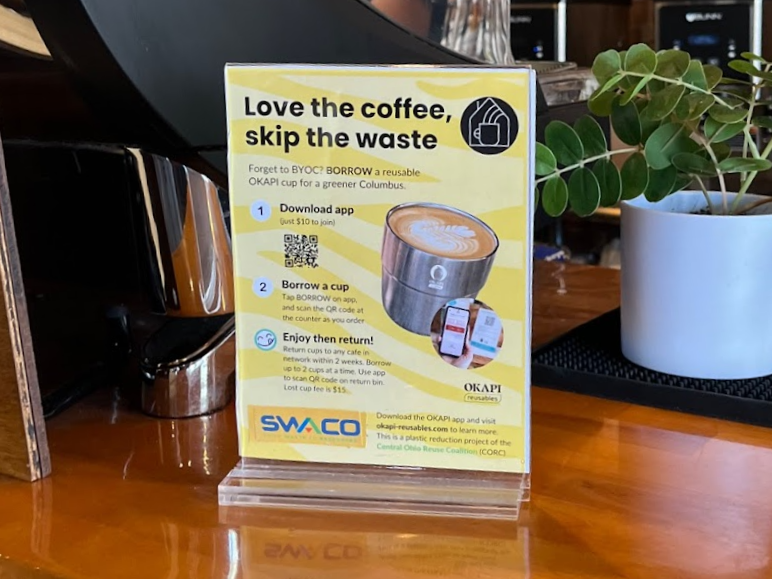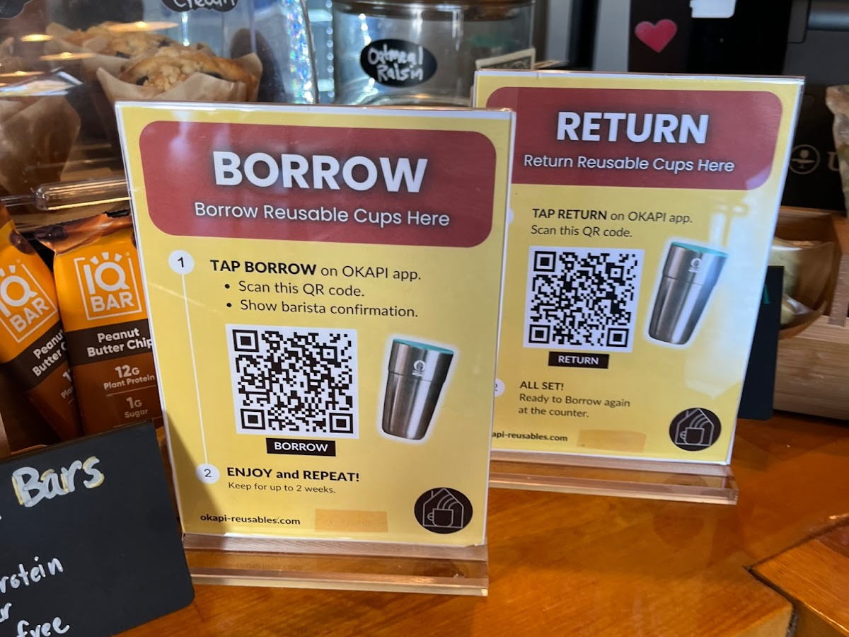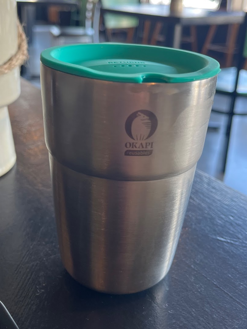 While researching current initiatives towards circularity locally, I found out that since this past January, Columbus is part of a pilot program to reduce the amount of single use coffee cups from cafes. In partnership with Okapi Reusables, currently 9 cafes across Columbus are testing out their program to encourage using metal tumblers instead of the single use cups coffee orders usually get placed in. Participants are asked to download the app, and then there is a one time $10 fee to get started using their cups. They base it off of a library borrowing system where you get two weeks to return the tumbler that you most recently used. By scanning a QR code at the time of ordering you are able to get up to two reusable tumblers at a time which makes it convenient if you already have one checked out and forgot to bring it back. Once your drink is in the cup, you are then asked to wash it initially before scanning the QR code to turn it back in at any of the participating cafes return bins. However the cafes then wash them on their end too before going back into circulation. I thought that this program would be an interesting way to do participant observation to fully get a grasp on how the process goes from start to finish while also informally engaging in a few casual interview questions.