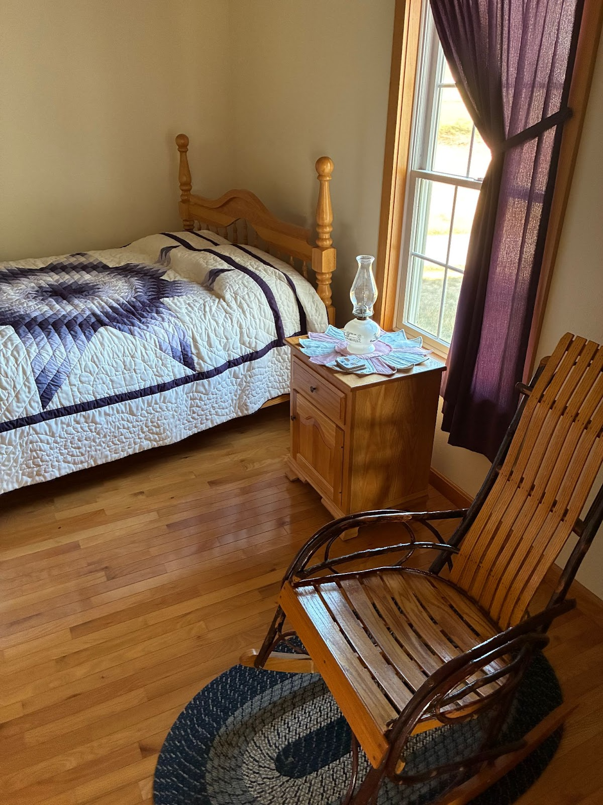 The house itself was open to be explored by guests. Certain aspects were functional for the workers, while some were in place like an exhibit for guests. Materially, all the furnishings were hand-crafted wood from tables to chairs and the quality of the craftsmanship was easy to see. Mock-bedrooms also had wood crafted bedframes, with quilted blankets. An original singer sewing machine was in the middle of a quilting project. Even the public bathrooms had tin stalls for separation, instead of the usual plastic walls. It was easy to see these timeless materials and practices everywhere you looked, even the wooden floors. There was some interesting creep of modernism when taking a closer look, namely the houses themselves. The patios, and stairways leading up to the house, and some railings were new and shiny white made of some sort of plastic material common in newer homes. They were hollow inside, and the material difference was noticeable.