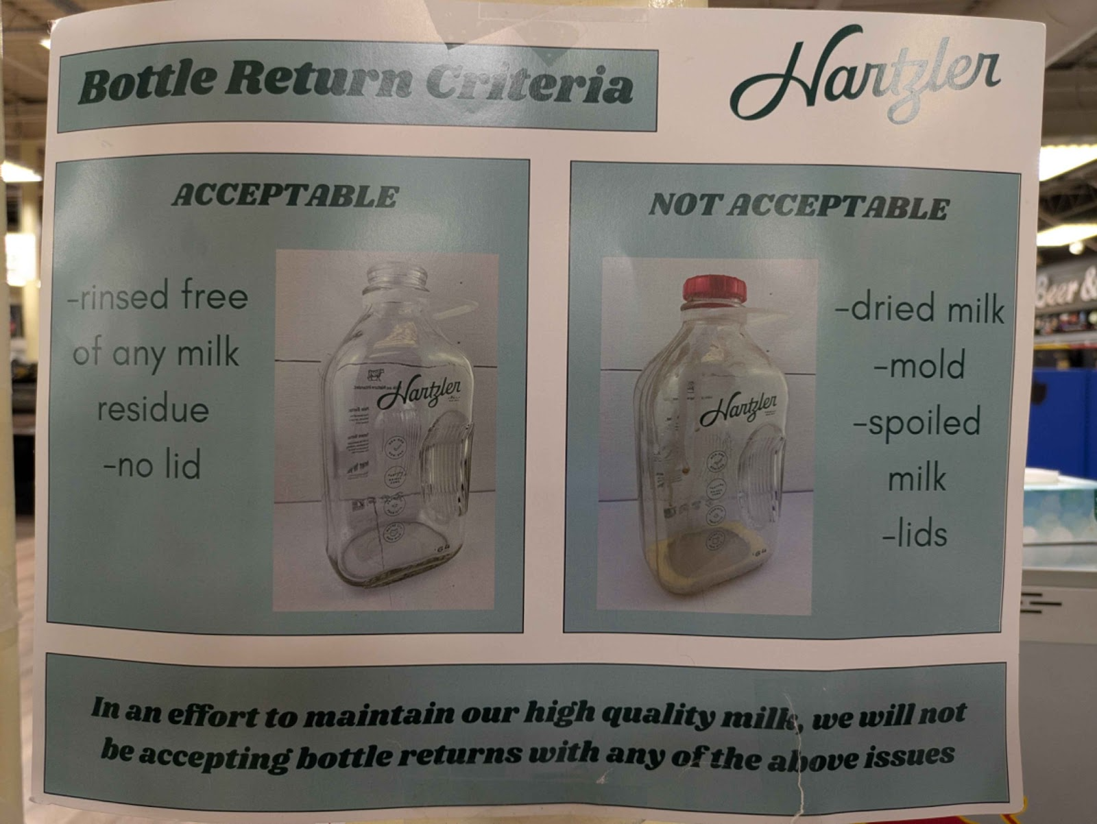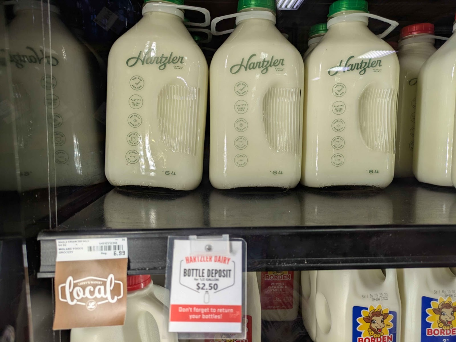 Lastly, there is a unique process being done between Lucky’s, their customers, and a milk company called Harzler that is an example of a circular economy. Milk is sold in reusable milk bottles. Customers buy this milk with an additional deposit charge. After finishing the milk, they clean the containers and return them to Lucky’s to be repaid the deposit. Lucky gets the containers back to Hartzler who refills them with milk to be sold again. Notably this is only done with the large bottle sizes, and they do not accept the caps back.