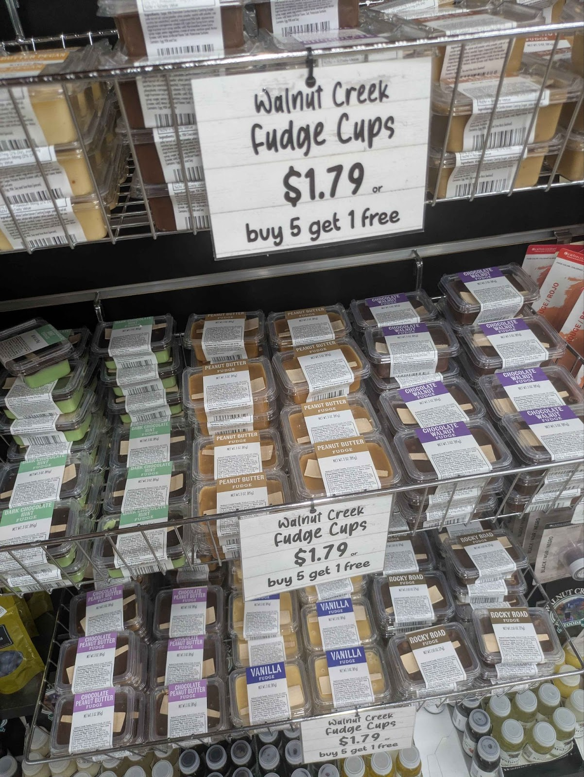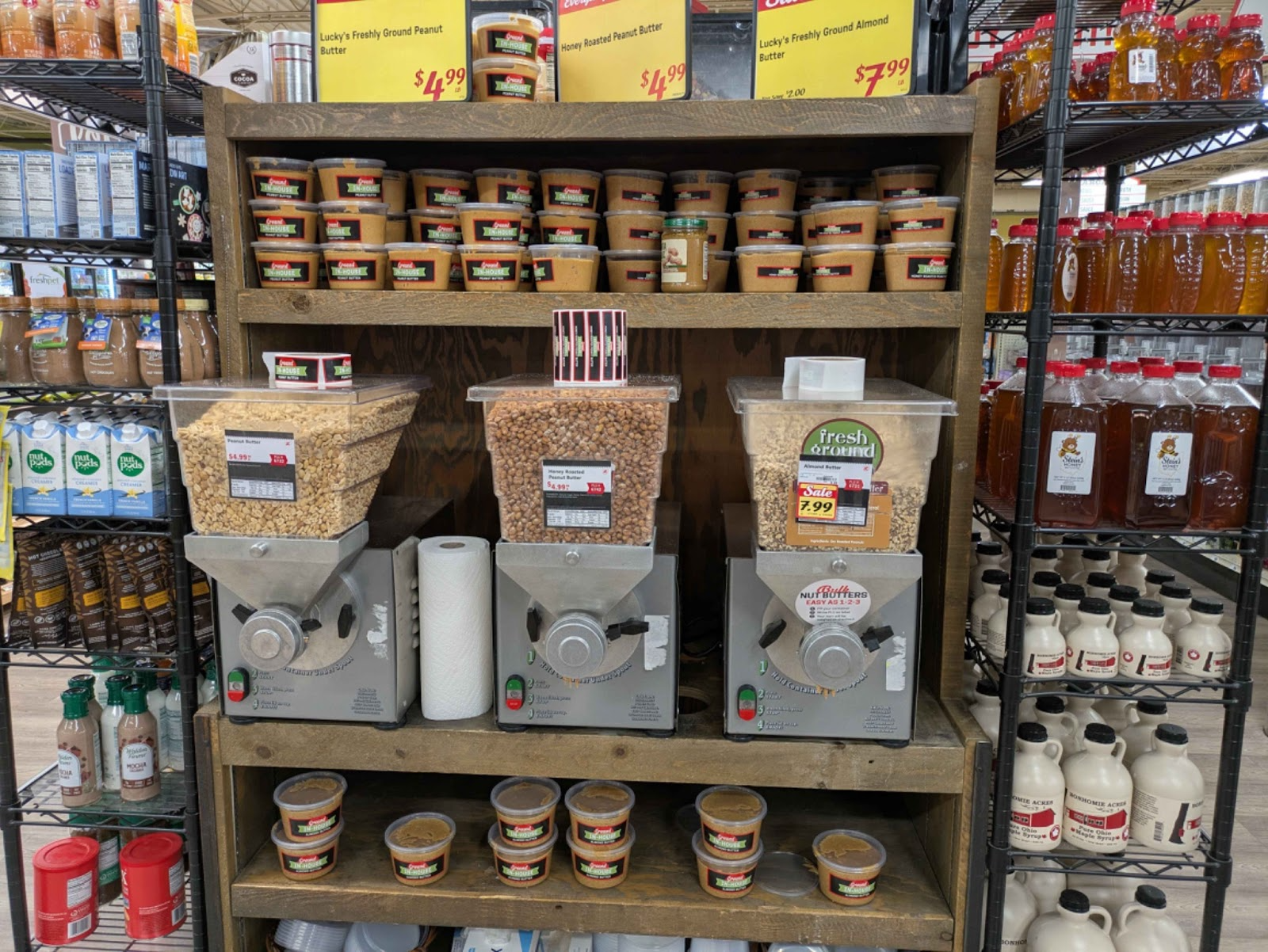 Similarly, fresh peanut butter and almond butter comes from these machines. Plastic containers come already filled, with the option for customers to refill it or bring their own containers. This is Walnut Creek branded peanut butter.