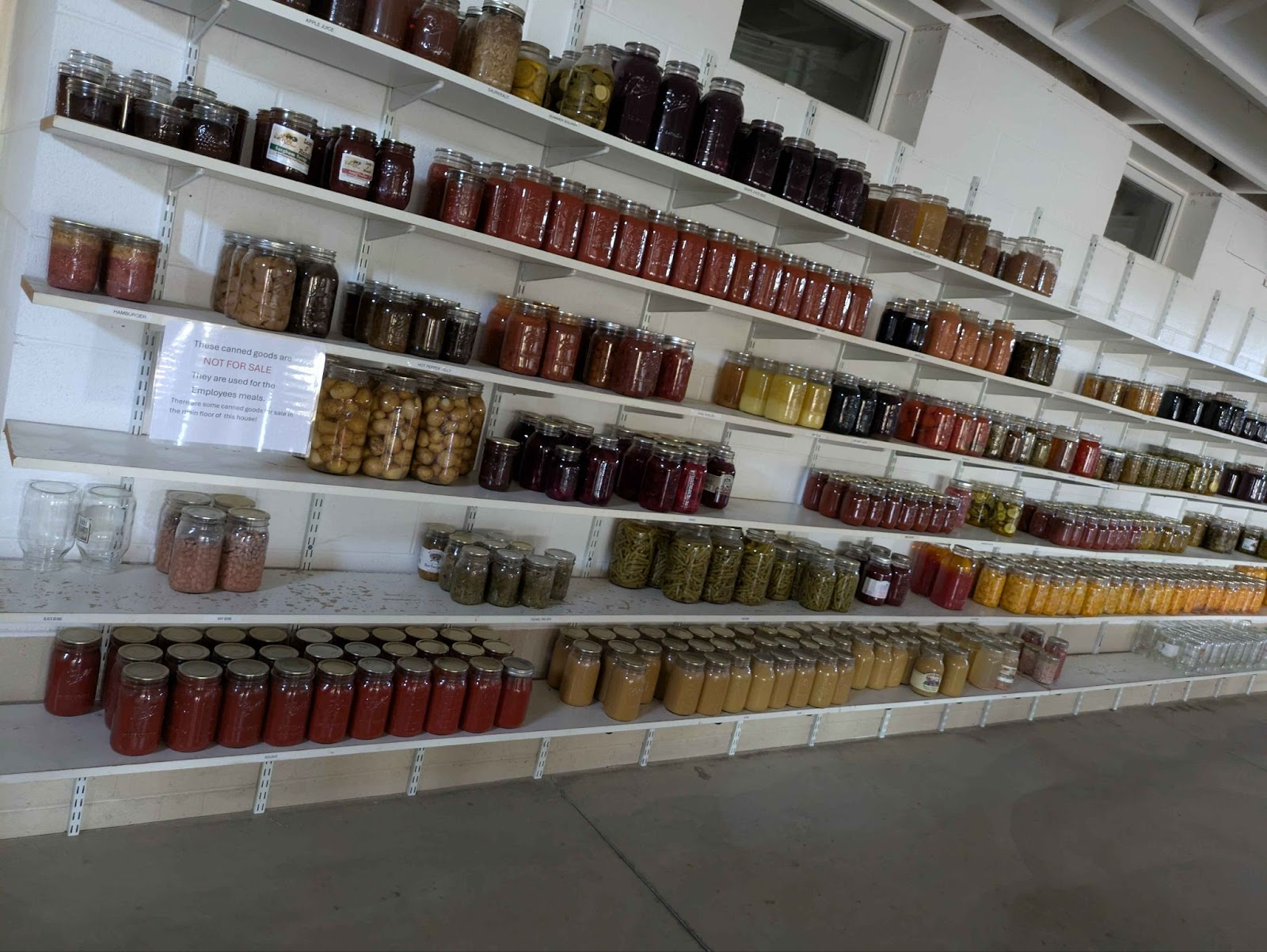There were many animals and gardens on the farm property. Reusable plastic buckets and cardboard for storage/shipping could be seen in use on the fields. Some of the plants grown on the property include apple trees, grape vines, various gourds, and other small scale gardens with things like peppers. The farm makes fresh lunches for its employees with its stores of canned foods. Canning takes place on-site, often with fresh produce and there is an extensive range of options. The plants on-site are not entirely self-sufficient, and workers mentioned needing to get tomatoes, potatoes, and beans from other sources.