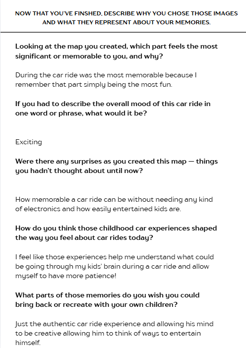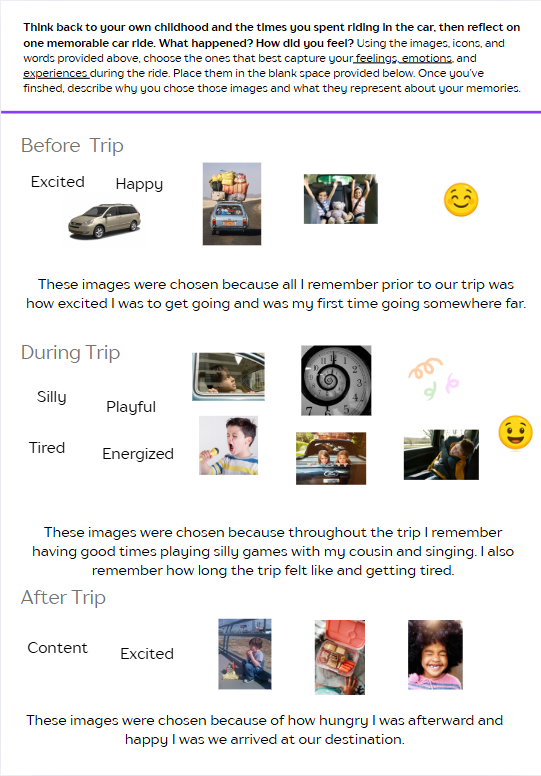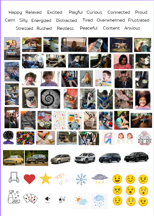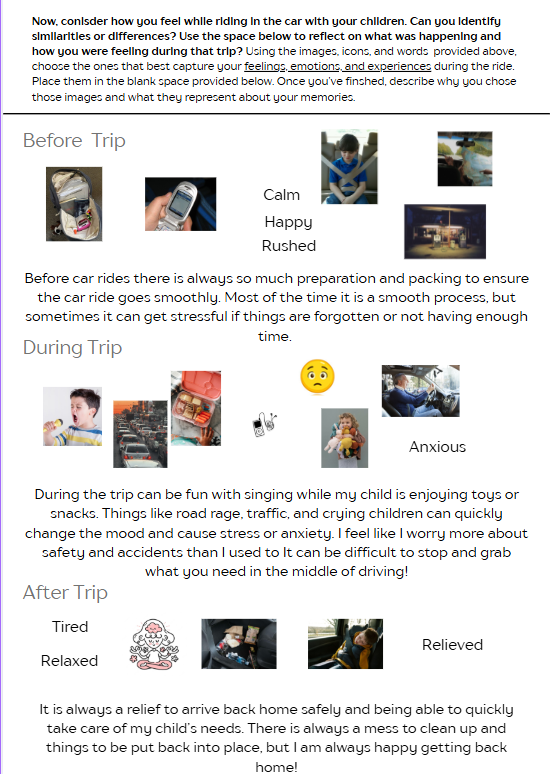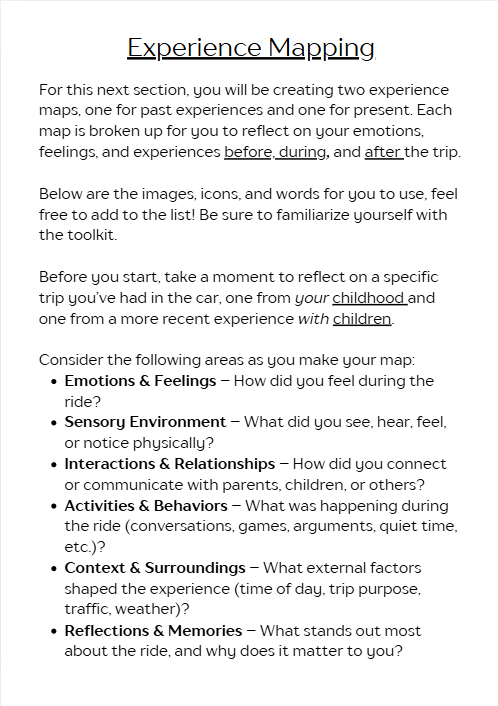 This activity guided participants in creating an experience map that asked them to reflect on two car rides: one from their childhood as a passenger, and one from a recent experience as a driver with children. Using a toolkit of images, icons, and words, participants mapped how they felt before, during, and after each ride. I shared the activity with four individuals of varying backgrounds caring for children: a mother of two, a mother of one, a grandfather with custody of two, and a babysitter of two.