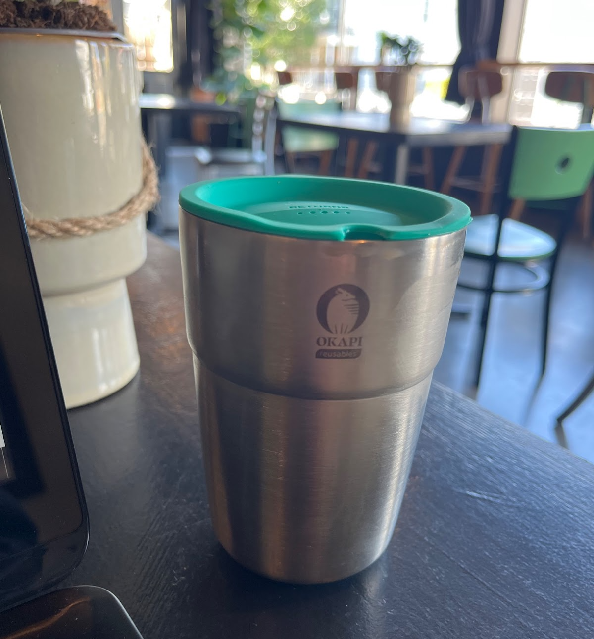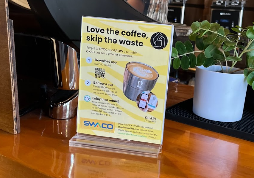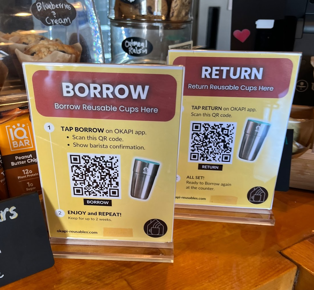 While researching current initiatives towards circularity locally, I found out that since this past January, Columbus is part of a pilot program to reduce the amount of single use coffee cups from cafes. In partnership with Okapi Reusables, currently 9 cafes across Columbus are testing out their program to encourage using metal tumblers instead of the single use cups coffee orders usually get placed in. Participants are asked to download the app, and then there is a one time $10 fee to get started using their cups. They base it off of a library borrowing system where you get two weeks to return the tumbler that you most recently used. By scanning a QR code at the time of ordering you are able to get up to two reusable tumblers at a time which makes it convenient if you already have one checked out and forgot to bring it back. Once your drink is in the cup, you are then asked to wash it initially before scanning the QR code to turn it back in at any of the participating cafes return bins. However the cafes then wash them on their end too before going back into circulation. I thought that this program would be an interesting way to do participant observation to fully get a grasp on how the process goes from start to finish while also informally engaging in a few casual interview questions.