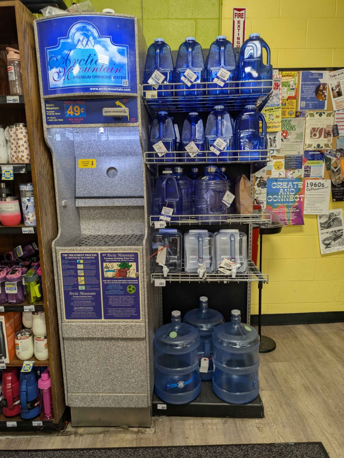 Water refill amenities provide fresh and filtered drinking water. There are reusable containers for sale right next to the water dispenser. This is a great alternative to individual water bottles in a package.