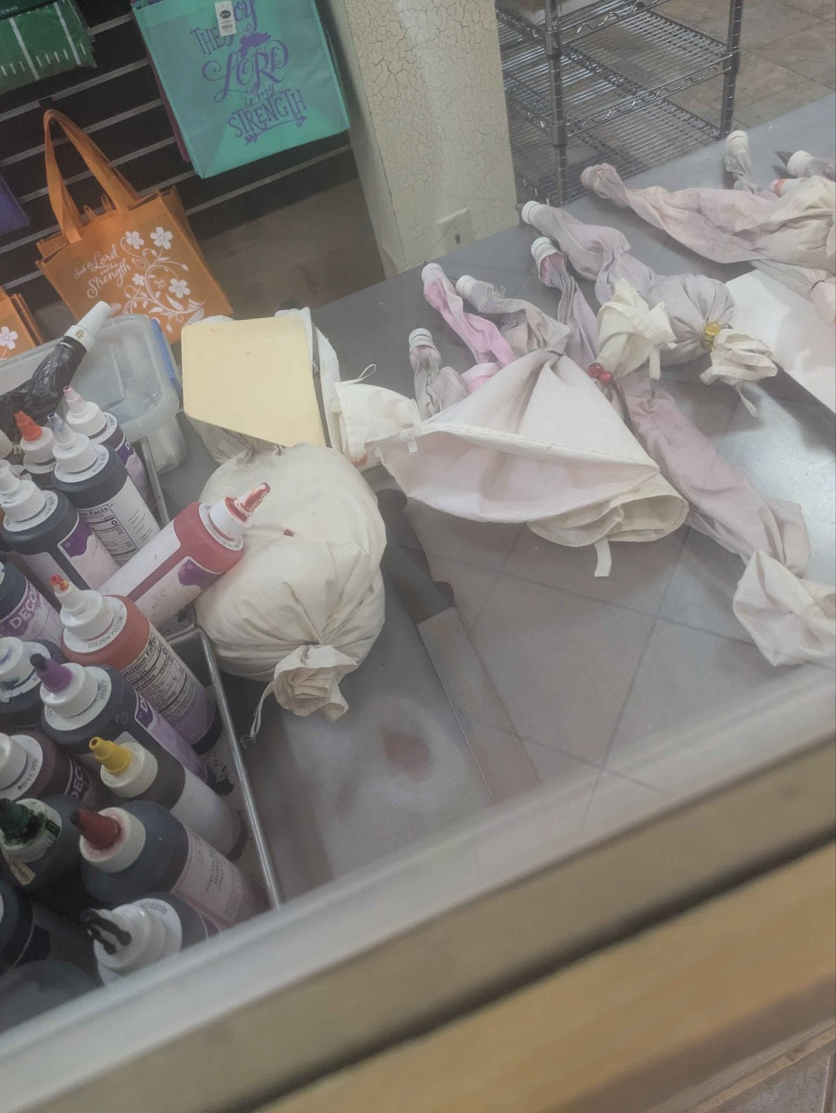 Some practices still have uniquely reusable materials. These piping bags being used to decorate icing onto cakes are made of reusable cloth. Once cleaned properly, they can be used again. This is very different compared to the usual one-use plastic bags that are discarded in large scale markets.