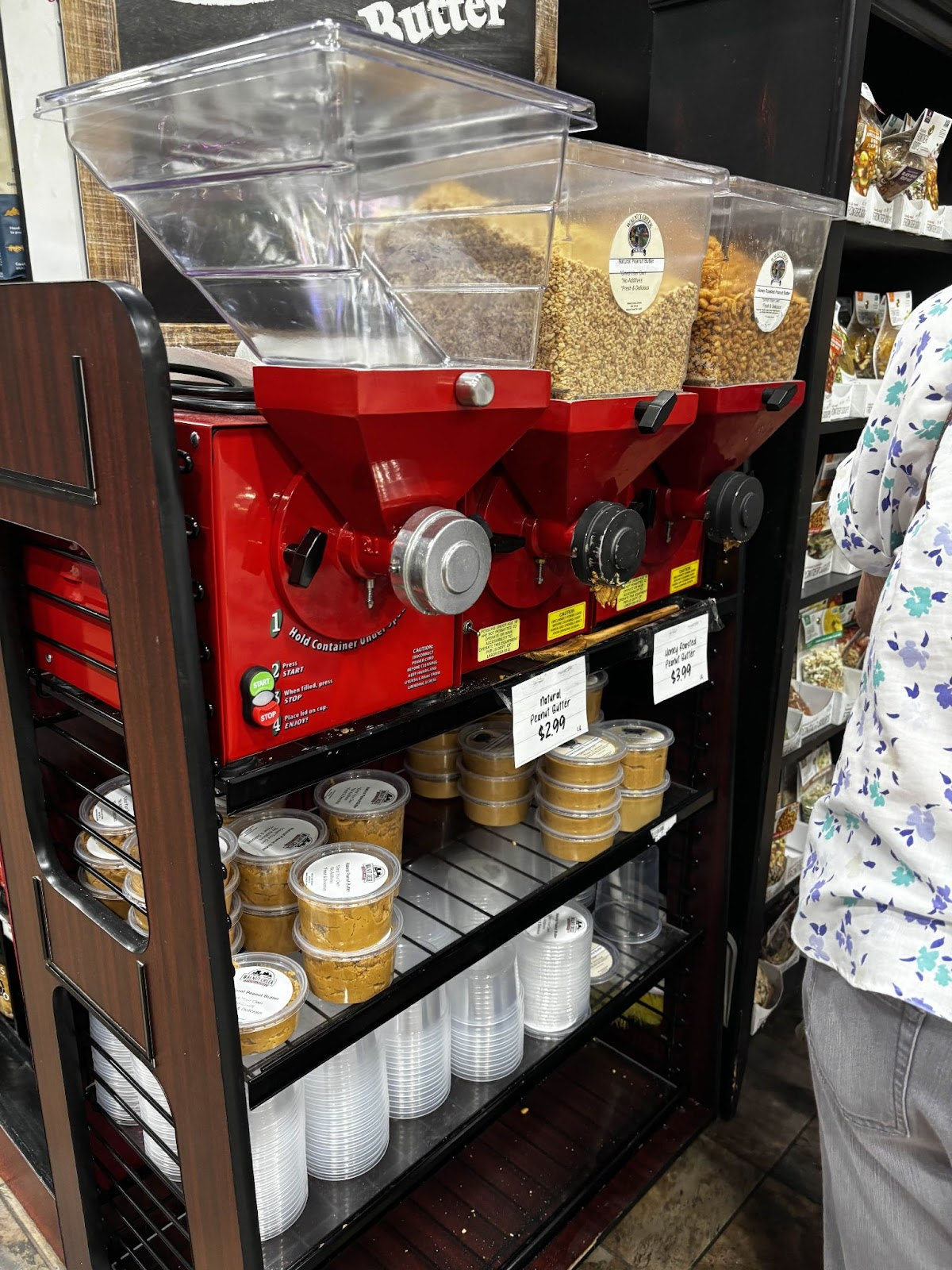 Similarly, fresh peanut butter and almond butter comes from these machines. Plastic containers come already filled, with the option for customers to refill it or bring their own containers. This is Walnut Creek branded peanut butter.