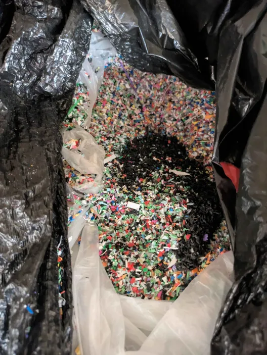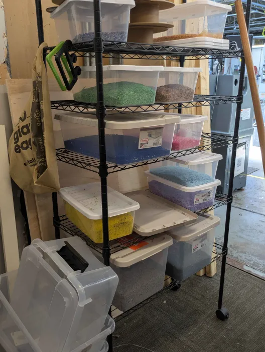Our team visited CDME, the Center for Design and Manufacturing Excellence, to see how a local Laboratory Coordinator is trying to tackle the PLA waste issue. Lili Hurst has reached out to many schools and libraries in the area that would potentially have a wastestream. To then set up a collection system and utilize the machines at the facility to shred and process the spent PLA. During our tour she showed us the 3D printing room where she has been experimenting extruding the pelletized and shredded pieces in the hopes of creating new 3D printing filament. That process is proving to be difficult due to the brittle state of the material and the tolerances needed on the printers, but pressing the shreds into sheets is demonstrating to be more successful. The plastic sheets can then be used to laser cut and CNC objects like new. She talked us through the collection process which is now mainly just herself making trips to the facilities that agreed to have a recycle bin near their 3D printers. We then were shown the large barrels full of the PLA she has been collecting and walked through the process of sorting the PLA by color, which then gets shredded, and the shreds get fed into another machine that turns the material into uniform pellets.