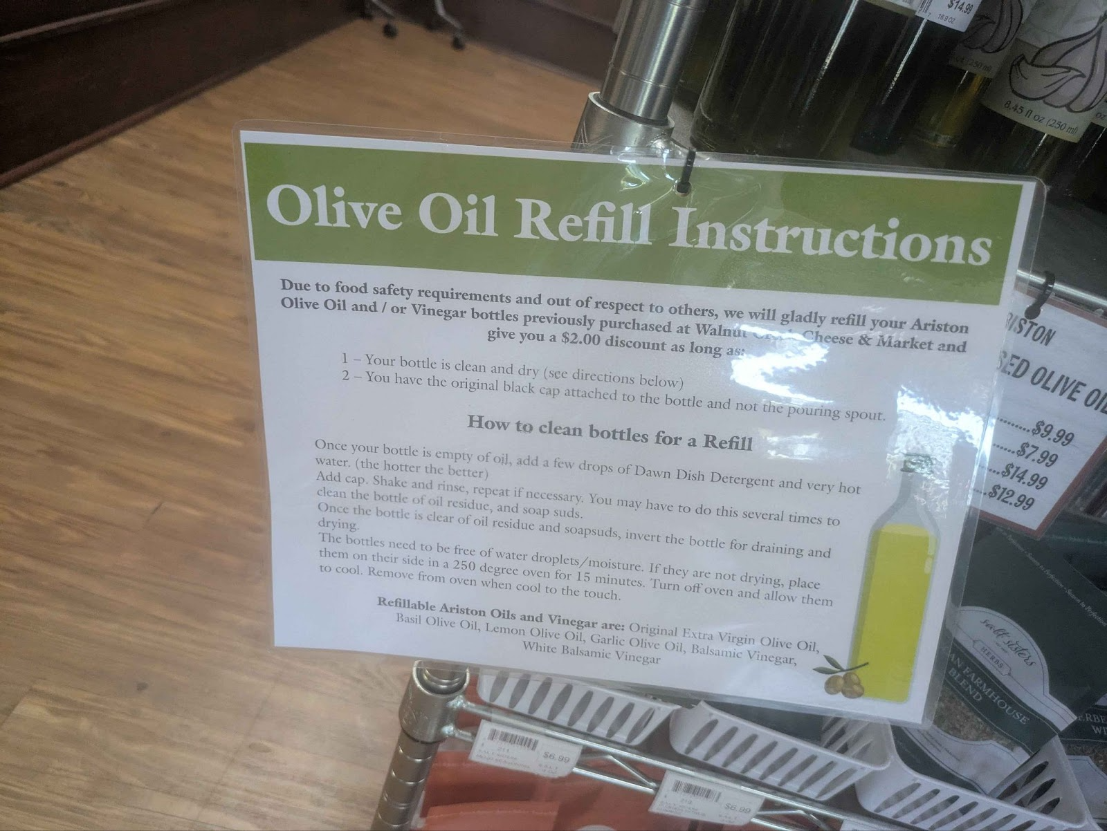 Finally, some of their artisan oils and vinegars offer refills with a two dollar discount if the customer brings back a clean bottle. This is especially interesting because the bottle must be from their product, making this very circular in nature.