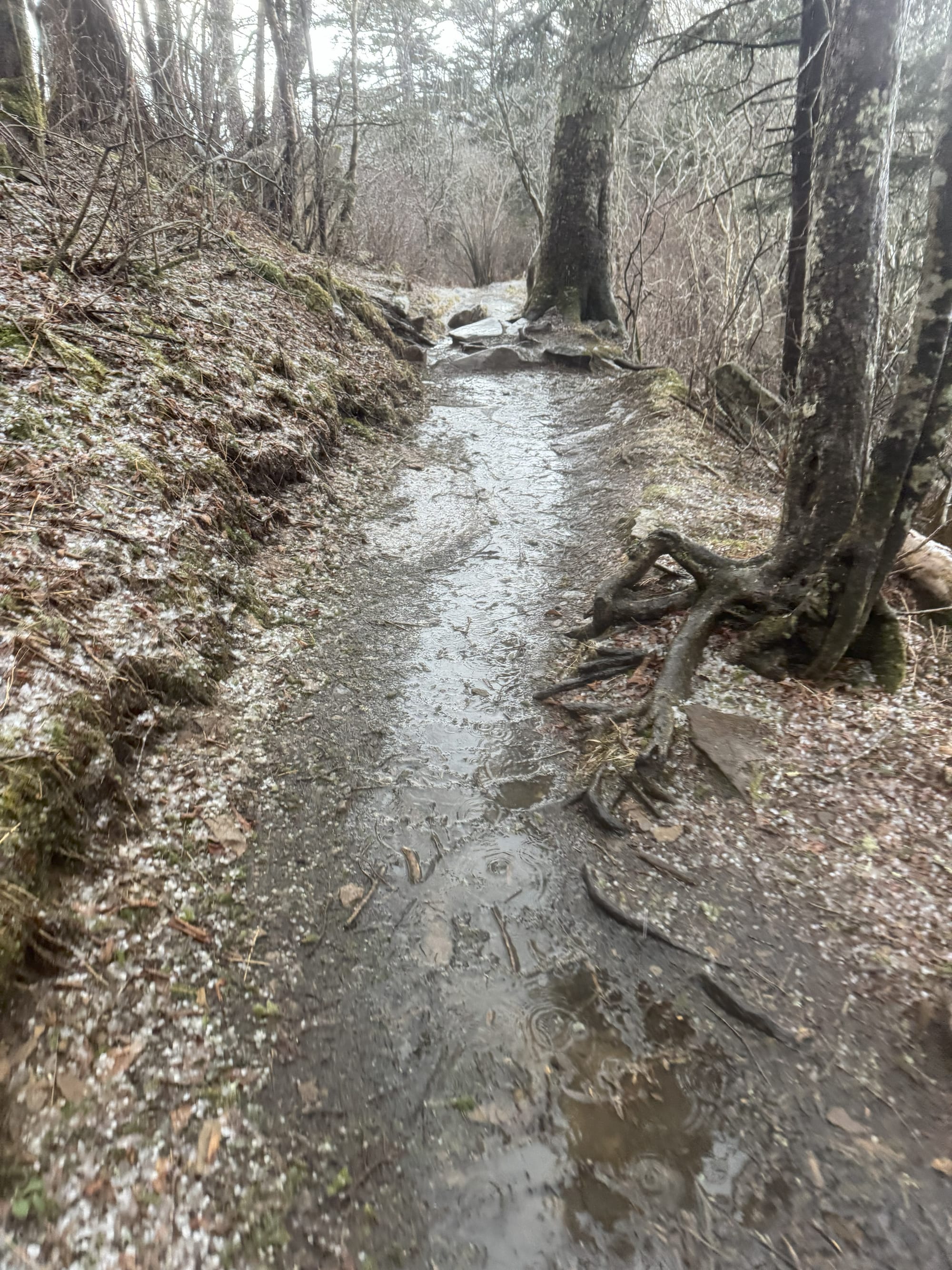 - It became very cold with the high elevation, and there was some difficult terrain. Snow, slush and ice patches were present on the trail, which was along a cliffside.