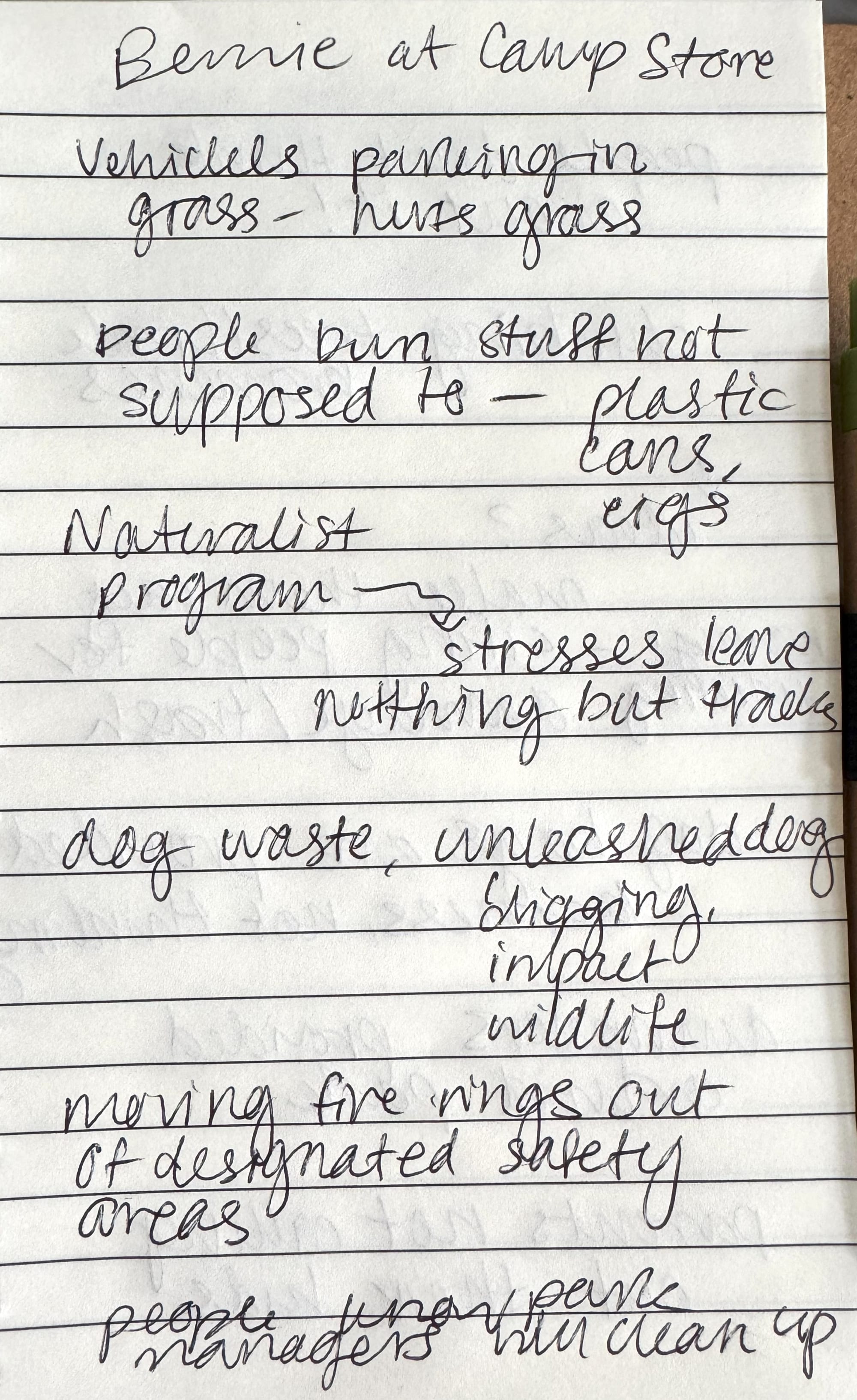 Q: As an employee of the Mohican campground, what have you observed park visitors doing that is detrimental to the environment, or something they should not be doing for safety reasons, or otherwise?