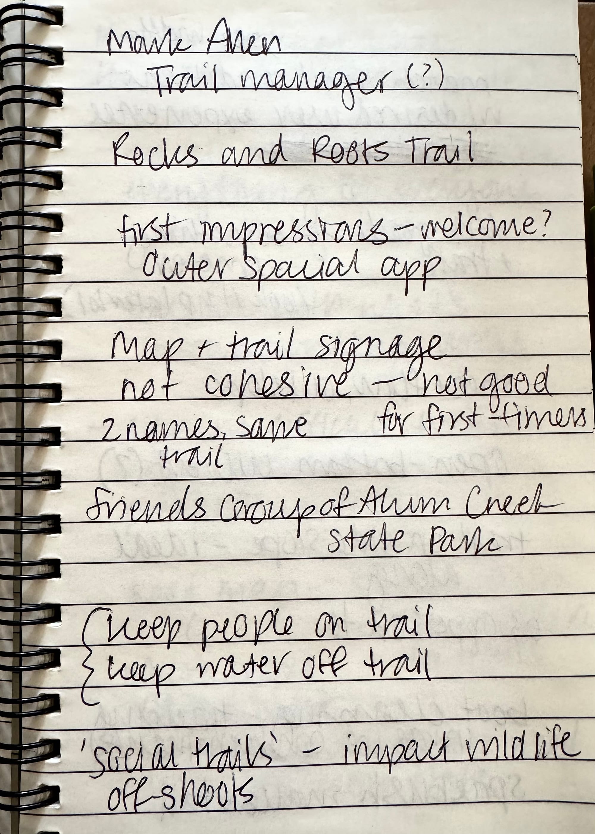 - Suggests adding more signs at the trailheads about hazardous areas along the route, descriptions about the terrain/conditions.