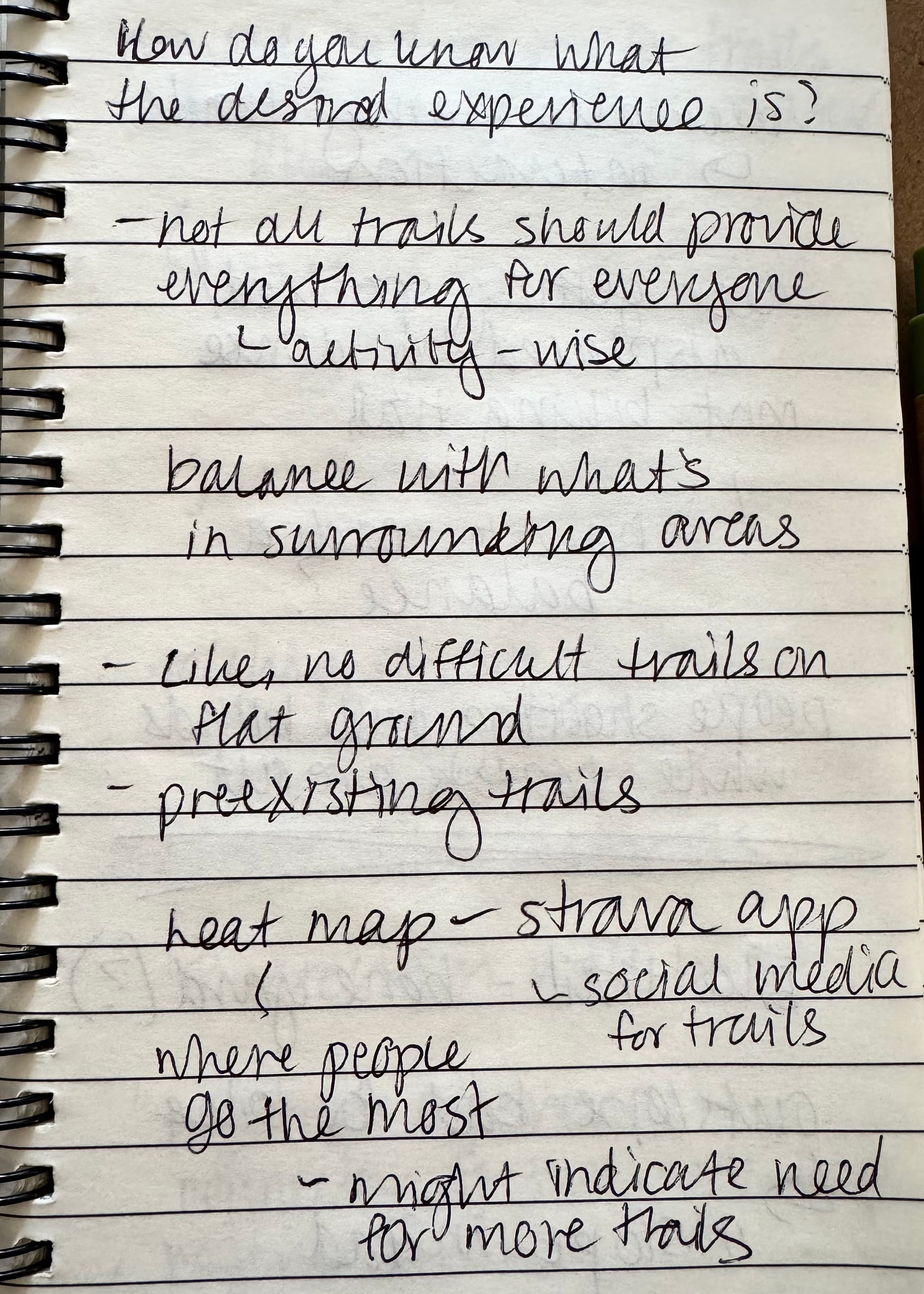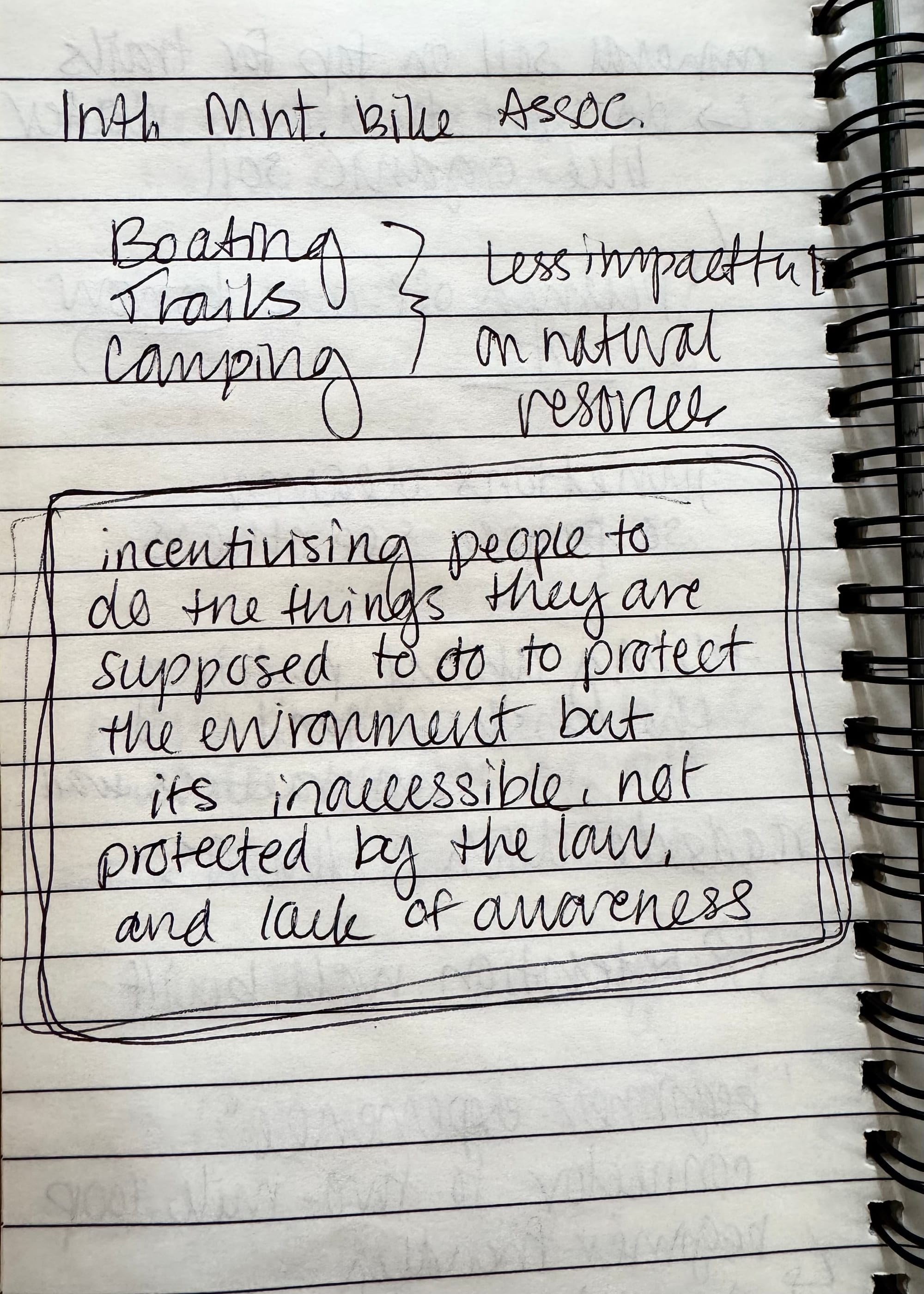 [At this point in the conversation, Jade and I discuss our outdoor experiences centered around an appreciation for nature and how that might be implemented into our state parks.]