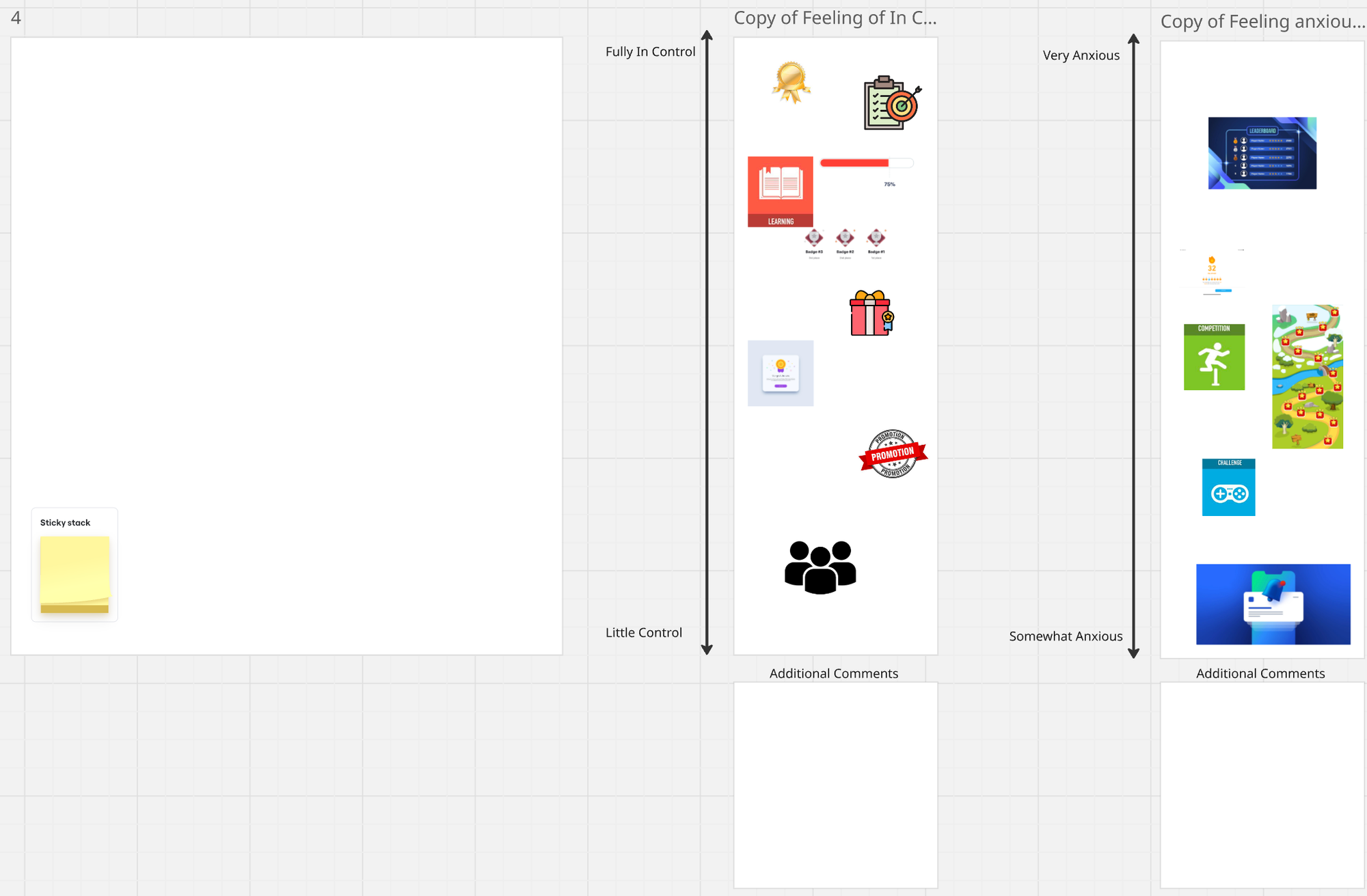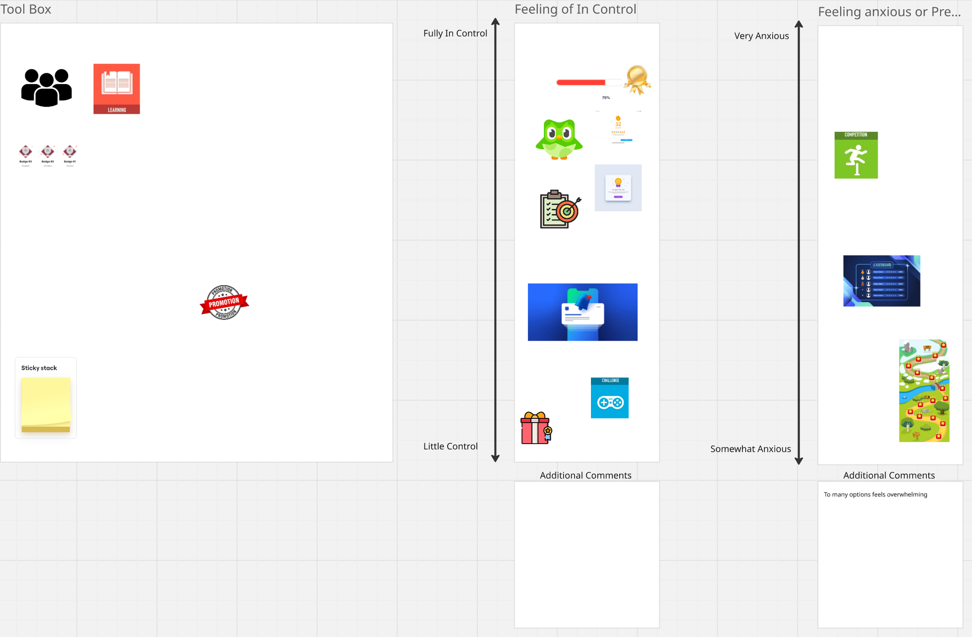 For my additional research method I chose to do a make method that utilized an imagery tool box with common gamification methods, participants were also able to leave comments with sticky notes or find additional images online. I then asked participants to remix and rank features that would make them feel in control of their money vs. anxious or pressured. I did this on a scale to get a better understanding of which methods allowed users to feel more in control or anxious.