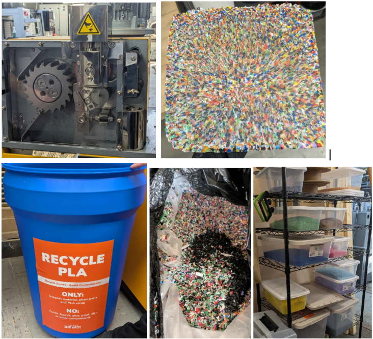 Our team visited CDME, the Center for Design and Manufacturing Excellence, to see how a local Laboratory Coordinator is trying to tackle the PLA waste issue. Lili Hurst has reached out to many schools and libraries in the area that would potentially have a wastestream. To then set up a collection system and utilize the machines at the facility to shred and process the spent PLA. During our tour she showed us the 3D printing room where she has been experimenting extruding the pelletized and shredded pieces in the hopes of creating new 3D printing filament. That process is proving to be difficult due to the brittle state of the material and the tolerances needed on the printers, but pressing the shreds into sheets is demonstrating to be more successful. The plastic sheets can then be used to laser cut and CNC objects like new. She talked us through the collection process which is now mainly just herself making trips to the facilities that agreed to have a recycle bin near their 3D printers. We then were shown the large barrels full of the PLA she has been collecting and walked through the process of sorting the PLA by color, which then gets shredded, and the shreds get fed into another machine that turns the material into uniform pellets.