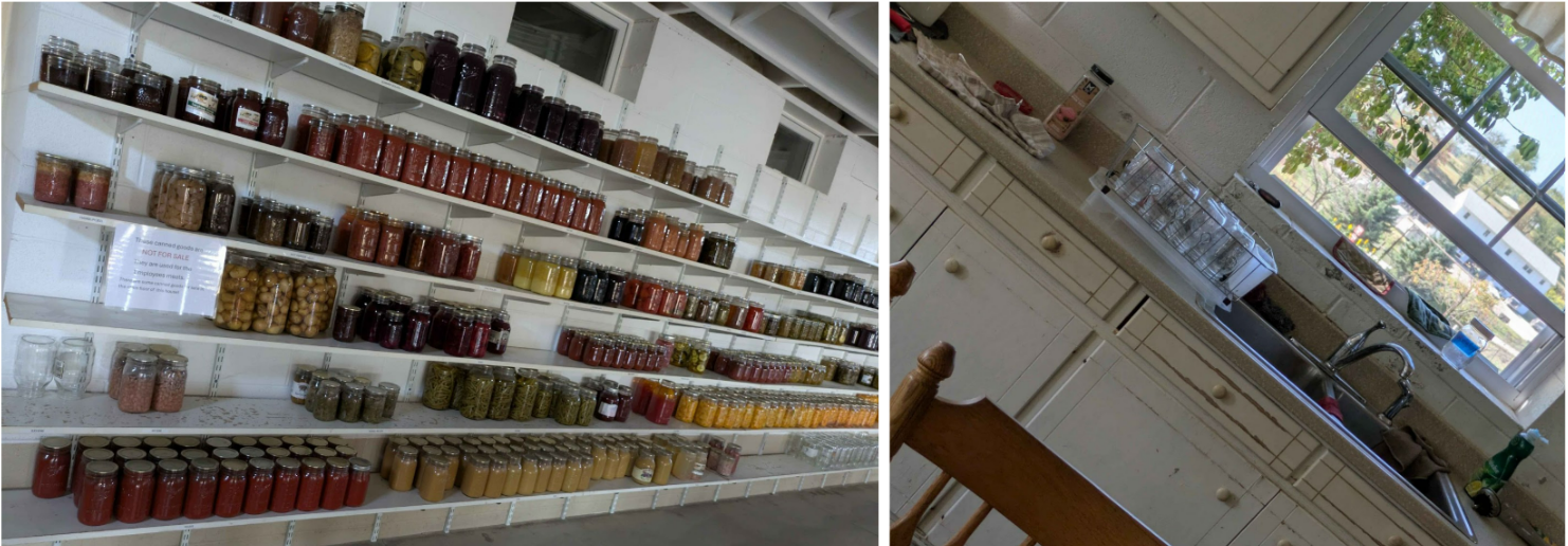 There were many animals and gardens on the farm property. Reusable plastic buckets and cardboard for storage/shipping could be seen in use on the fields. Some of the plants grown on the property include apple trees, grape vines, various gourds, and other small scale gardens with things like peppers. The farm makes fresh lunches for its employees with its stores of canned foods. Canning takes place on-site, often with fresh produce and there is an extensive range of options. The plants on-site are not entirely self-sufficient, and workers mentioned needing to get tomatoes, potatoes, and beans from other sources.
