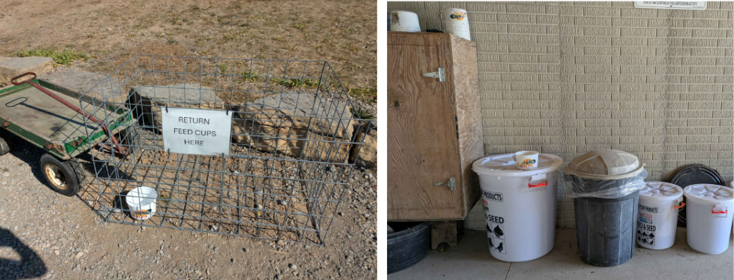 The animals on site range from classic farm staples like roaming cattle, to exotic birds and even giraffes and zebras. It is important to acknowledge that this farm is open to the public, and many things are in place as part of an experience to draw in guests. This being said, there are many animals on site that have functional purposes. For instance horses are used to pull carriages and perform labor. Chickens, cows, and goats are all serving classic farm roles producing eggs, milk, or meat. The stranger animals, like llamas and deer could contribute in similar roles, but giraffes and zebras are present for purely entertainment purposes. The role of the exotic animals tended to function more like a zoo than a farm in certain aspects. Notably, the feed containers that guests could buy to interact with the animals were reusable and collected at various drop-off points once empty to be refilled and redistributed to future guests.